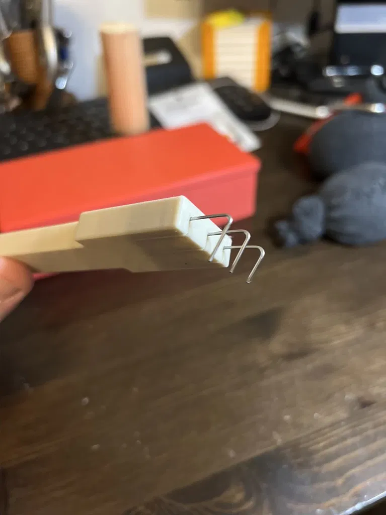 Dùng một ít dây thép lò xo 1mm để tạo hình móc, làm nhám đầu dưới bằng giấy nhám, dán vào các khe và cố định bằng các miếng nêm nhỏ.