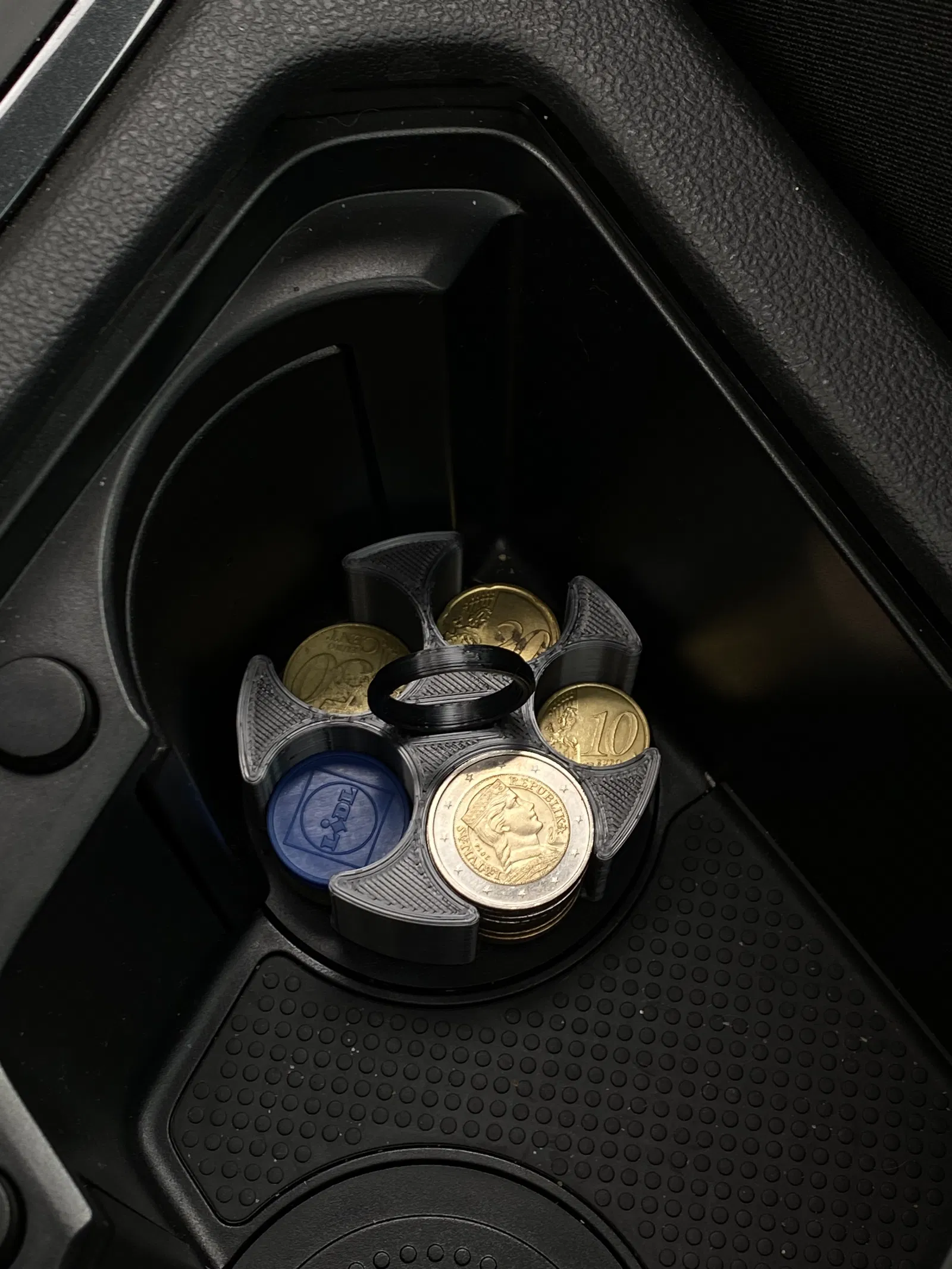 Bạn bực mình vì tiền xu Euro cứ lăn lóc trong xe, gây tiếng ồn mỗi khi vào cua? Khay đựng tiền xu Euro gắn vừa hốc để ly này sẽ giải quyết vấn đề đó. Thiết kế dễ lấy, có tay cầm, đựng vừa các loại tiền ¢10, ¢20, ¢50, €1, €2.