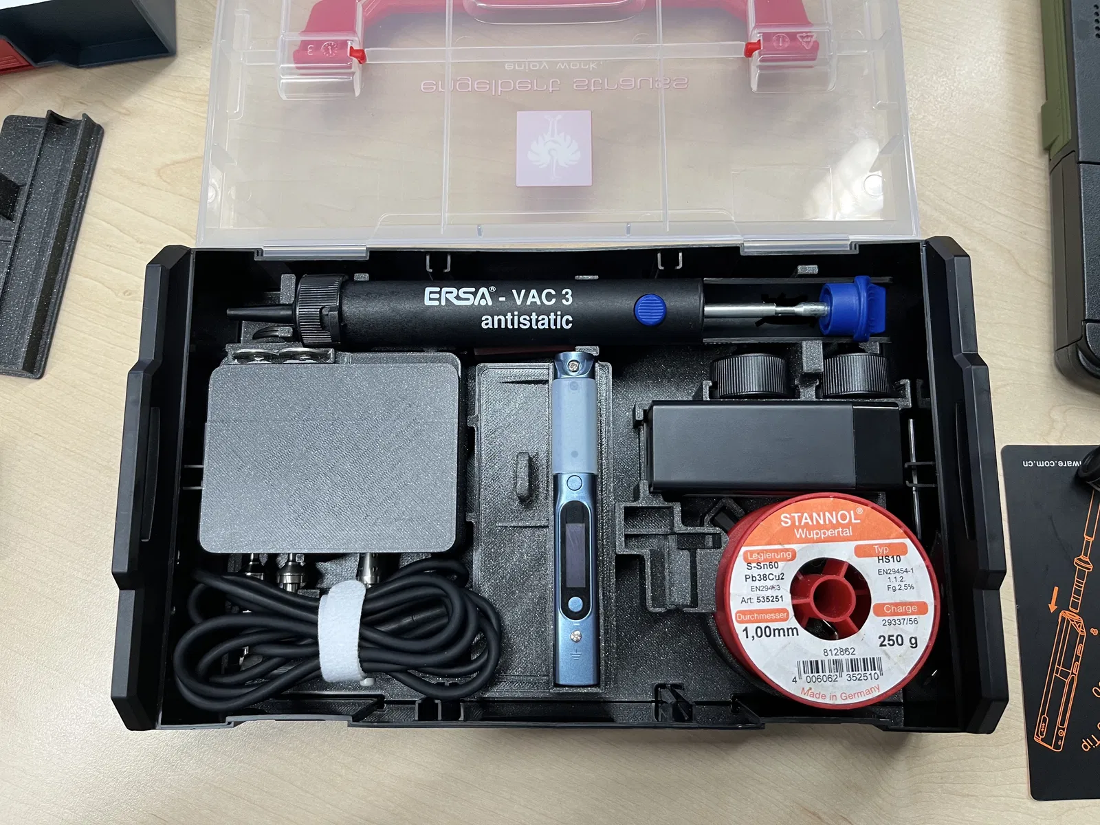 Một bộ chèn cho Sortimo L-BOXX Mini để lưu trữ an toàn PINECIL Soldering Iron của bạn cùng với một số phụ kiện. Tôi đã mua PINECIL kèm theo bộ nguồn như một bộ tại AliExpress cách đây một thời gian. Model bộ nguồn: XY-1389 C+A65W, nó có sẵn phích cắm US và đi kèm với Bộ chuyển đổi Đức. File L-Boxx-Mini_Pinecil-Lid_clean.stl dùng để thiết kế giá đỡ mỏ hàn khác (như TS100).