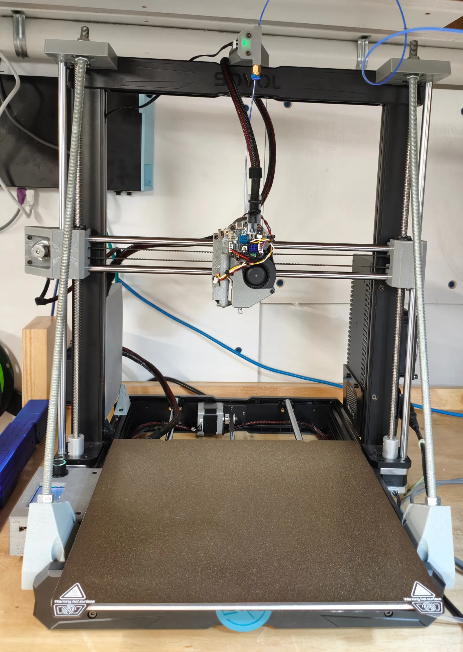 Đây là bộ khung gia cố cho cái Sovol SV06 Plus. Mấy bộ phận ở trên sẽ thay thế mấy bộ phận zin giữ mấy cái trục Z với trục ren Z phía trên. Mấy bộ phận ở dưới thì gắn vô mặt trước của mấy thanh nhôm chạy song song trục Y, dùng t-nut với ốc máy M5.