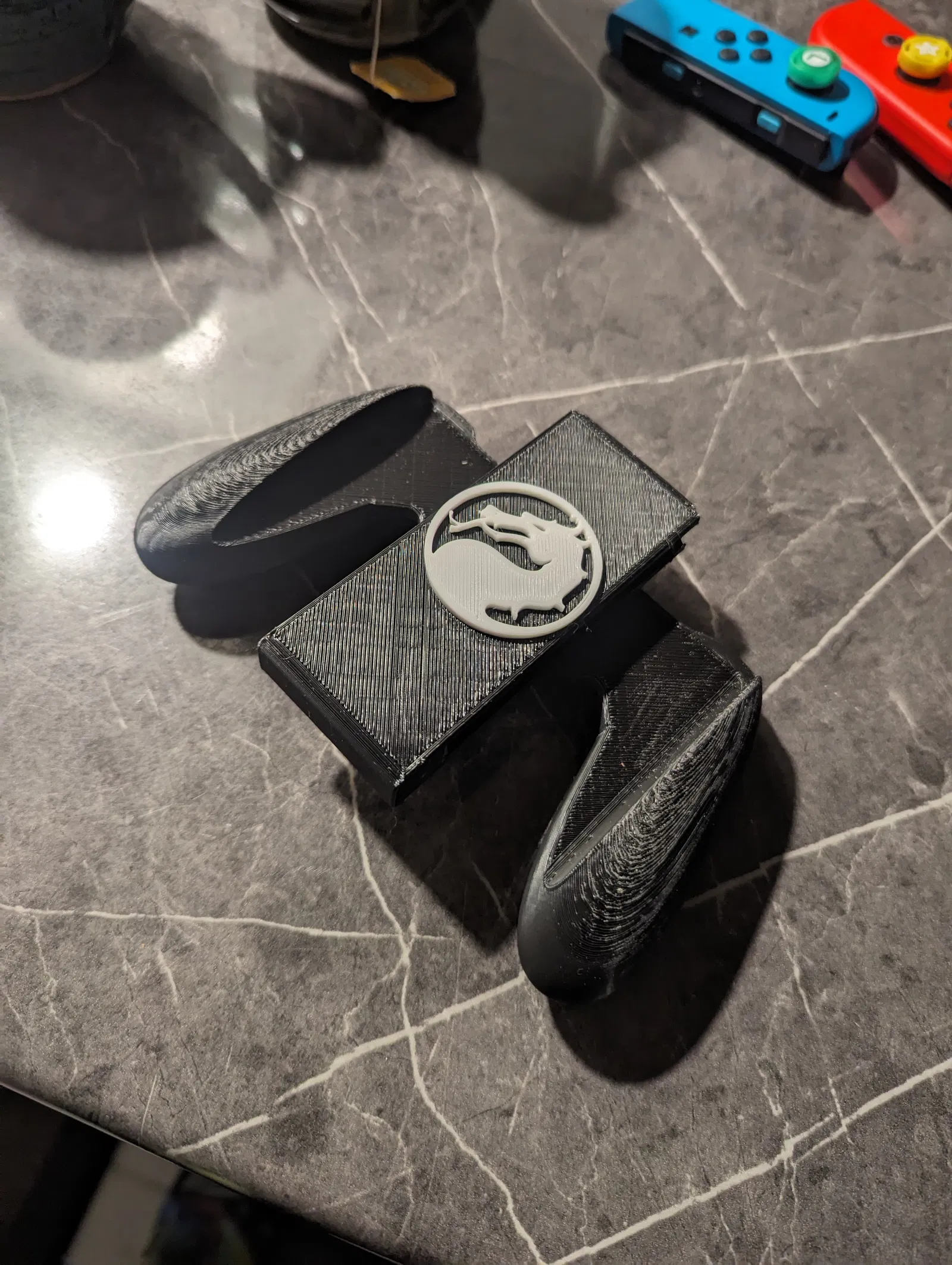 In tay cầm Switch Mortal Kombat với logo in phẳng trên bàn và phần còn lại có support. Có tùy chọn tạm dừng để đổi màu logo cho đẹp mắt.