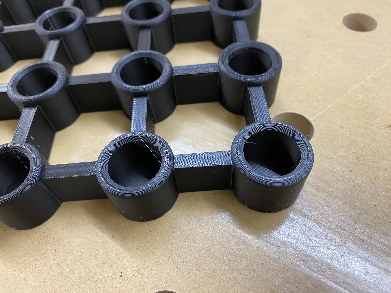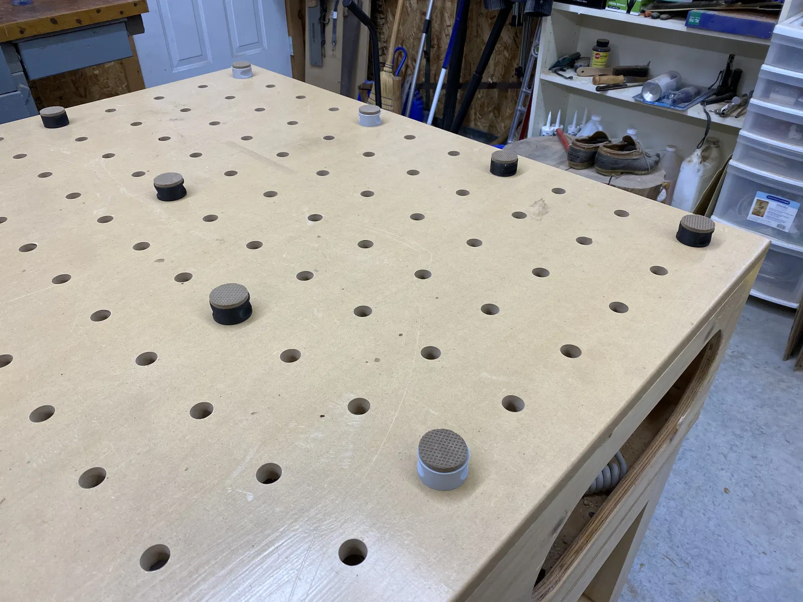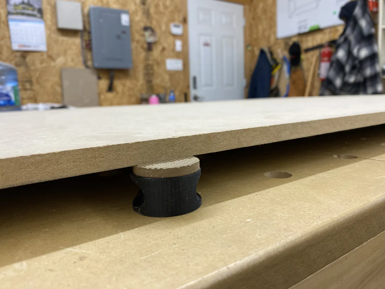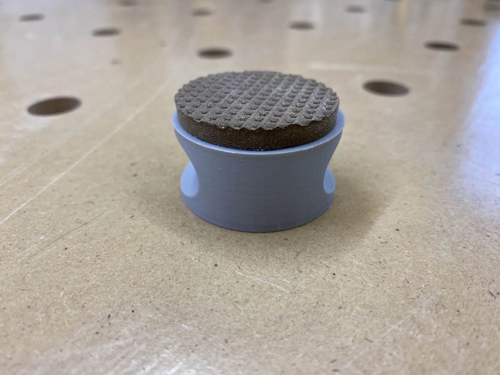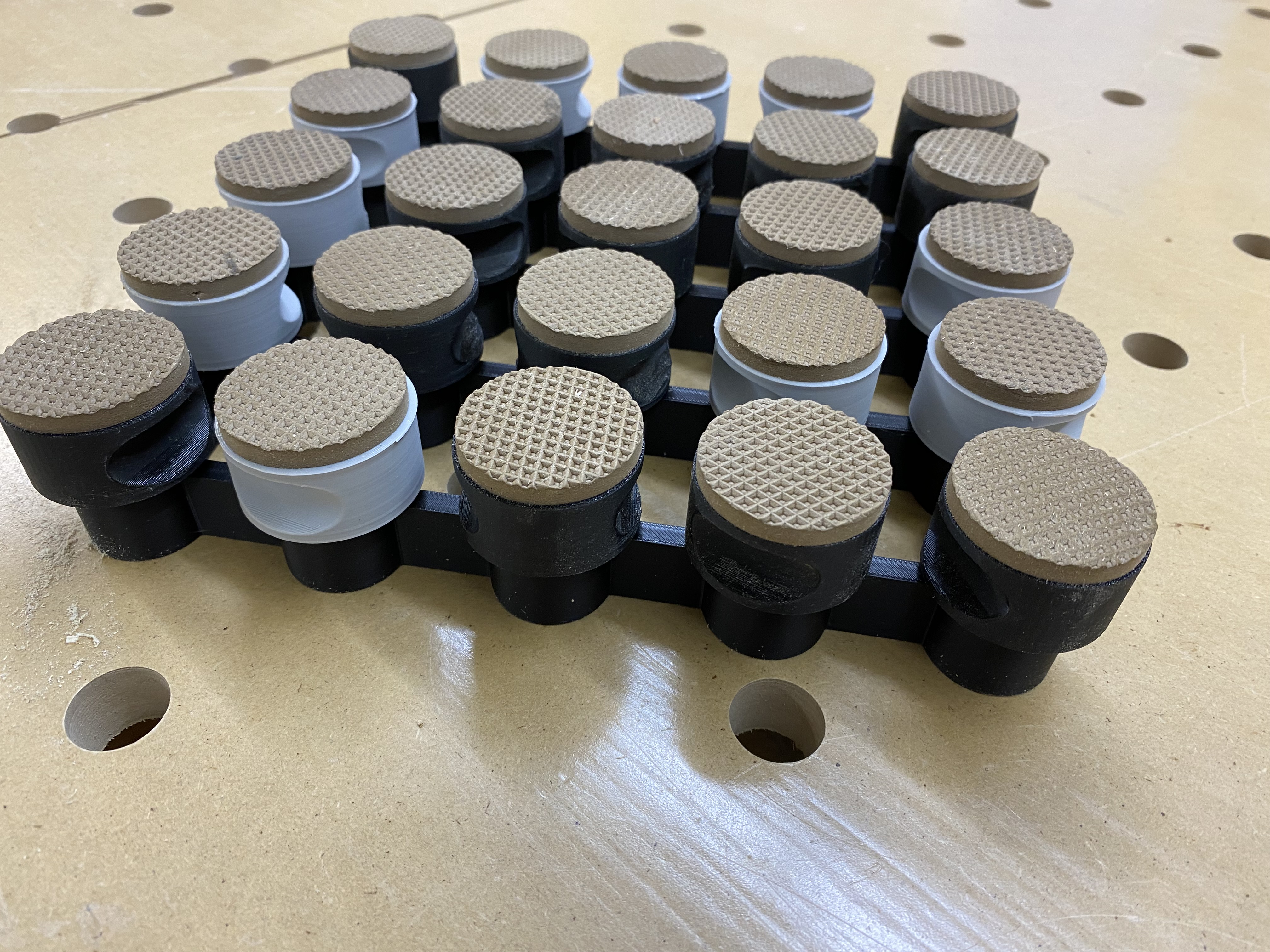 Mấy cái này là chốt chặn (bench dog) có mặt trên chống trượt. Bạn có thể dùng chúng để giữ phôi phía trên mặt bàn MFT để chà nhám và hoàn thiện. Chúng cũng dùng tốt cho việc cắt. Trục có đường kính 19.5 mm vì chúng không cần phải khít. Tôi đã cắt rất nhiều ván bằng cưa trượt của mình và chúng nâng gỗ đủ cao để lưỡi cưa không làm trầy mặt bàn làm việc. Đối với các tấm ván lớn, tôi đặt khoảng một chục cái xung quanh bàn làm việc để hỗ trợ. Nếu cưa vô tình cắt trúng một trong những cái chốt này thì cũng không sao. Tôi đã đính kèm một hình ảnh về miếng dán 3M mà tôi đã mua, đường kính 1.5 inch nhưng bất kỳ vật liệu chống trượt nào cũng có thể được sử dụng hoặc có lẽ là các hình tròn in bằng TPU. Chốt hơi nhỏ hơn 20mm một chút nhưng có các rãnh ở hai bên để dễ dàng nhấc ra. Tôi đã thêm một bộ tổ chức lưu trữ có thể chứa 36 cái. Lỗ cắm chính xác là 20 mm.