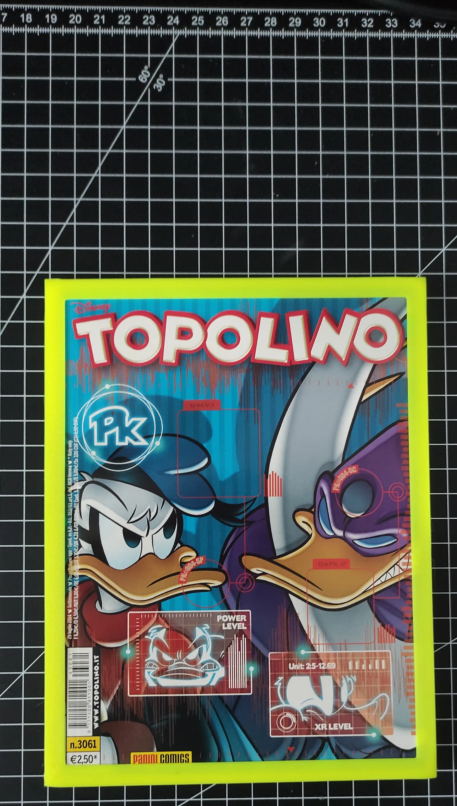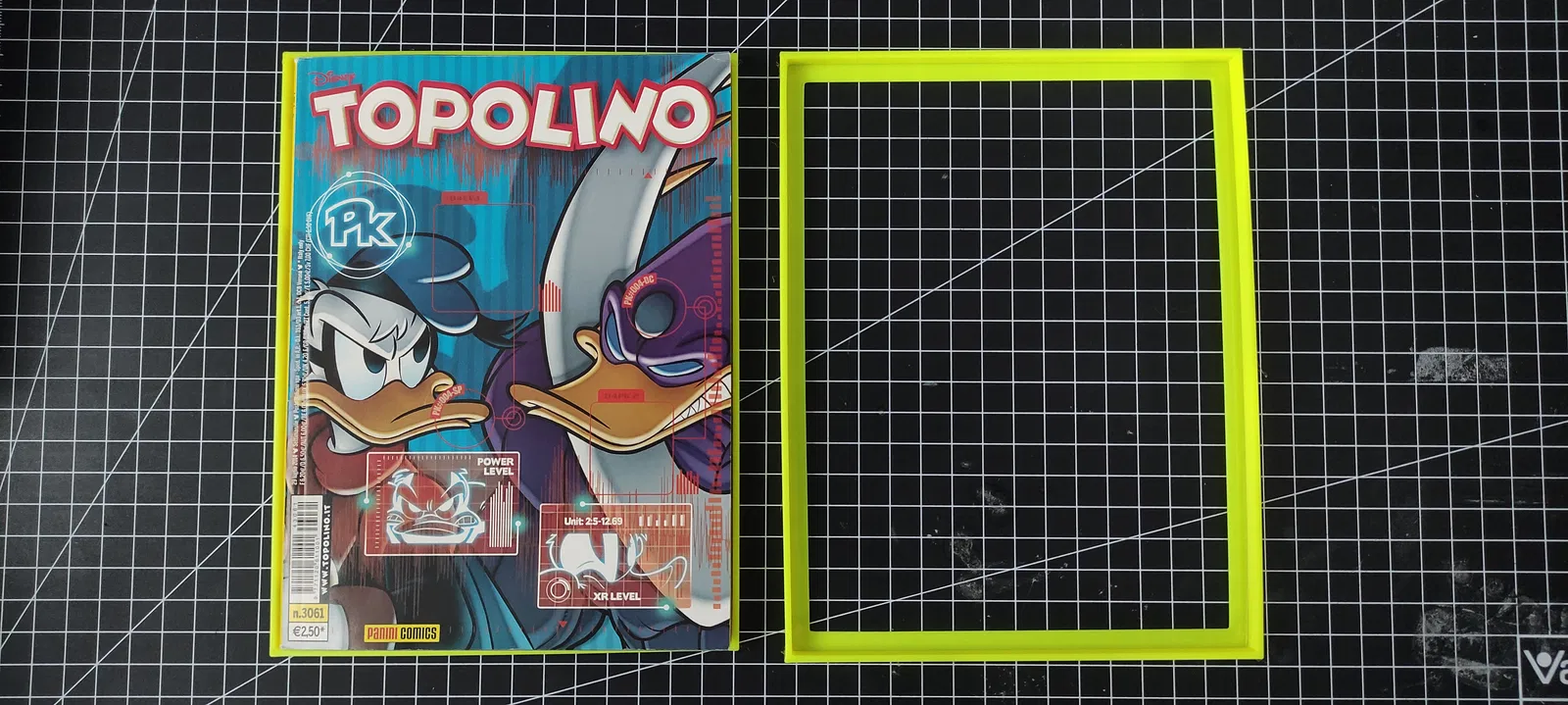 Cuốn truyện tranh được chụp trong ảnh là loại "Topolino" kích cỡ thông thường (tạp chí Mickey Mouse của Disney tại Ý) và có số đo là 14 cm x 18.5 cm x 0.6 cm (NgangxCaoxDày). Bạn có thể chỉnh kích thước trong phần mềm cắt lớp (slicer) yêu thích của mình để phù hợp với bất kỳ kích cỡ nào bạn cần.