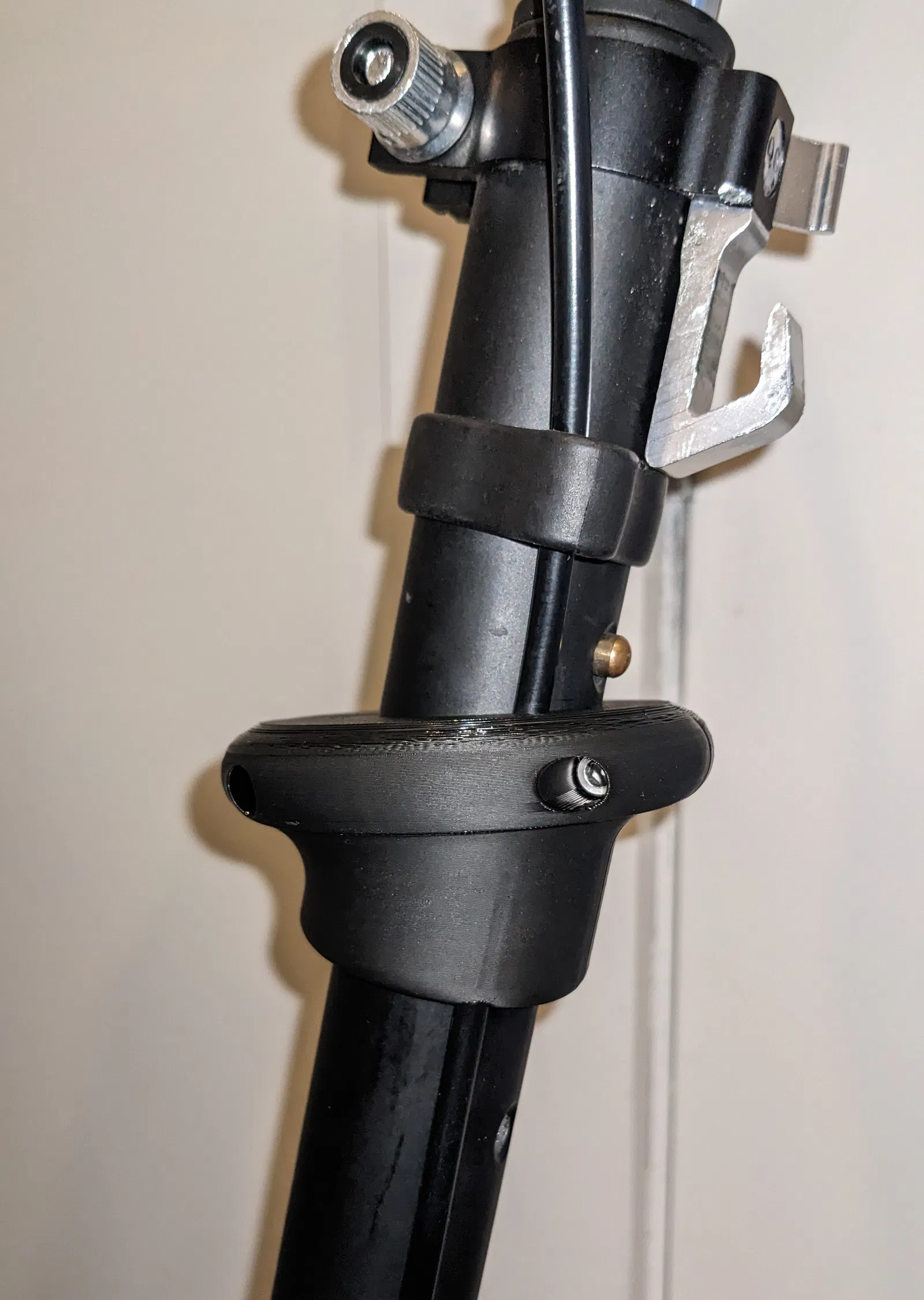 Tay cầm có một rãnh bên trong để dùng một miếng dây đeo cao su mỏng giúp tay cầm giữ chắc trên thân xe. Tôi đã tận dụng một miếng cao su từ đèn xe đạp cũ. Một ít keo CA giúp giữ dây đeo cao su vào rãnh khi lắp đặt. Một rãnh dọc sâu hơn được định vị để vừa với dây phanh tay của Mosquito.