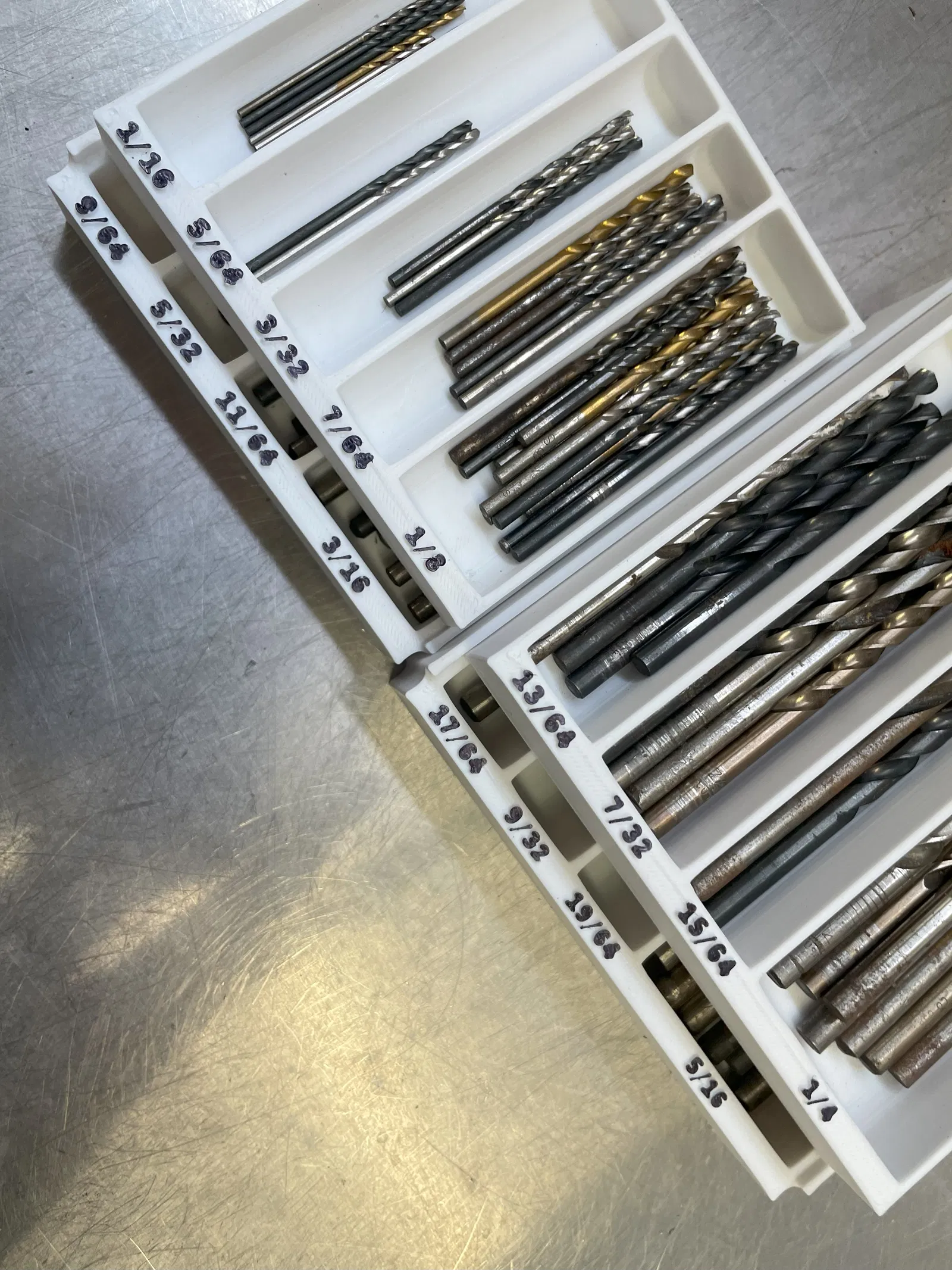 Đây là một bộ gồm 4 khay bit khoan tổ chức các bit từ 1/16 "đến 5/16". Chúng được thiết kế sao cho 2 trong các khay xếp chồng lên 2 khay còn lại để tiết kiệm không gian nhưng vẫn đủ ngắn để phù hợp với hầu hết các ngăn kéo hộp công cụ. Tôi đã sử dụng một điểm đánh dấu sắc nét. Cũng có thể được in bằng một màu tương phản.