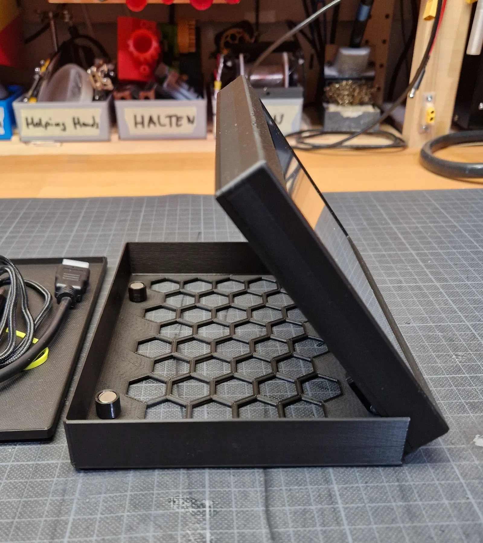 Hộp đựng kiêm đế cho màn hình LCD cảm ứng HDMI 7inch của Waveshare. Có thể tùy chỉnh bỏ phần bản lề và nam châm nếu chỉ cần hộp đựng đơn giản. Sử dụng vít và đai ốc M3.