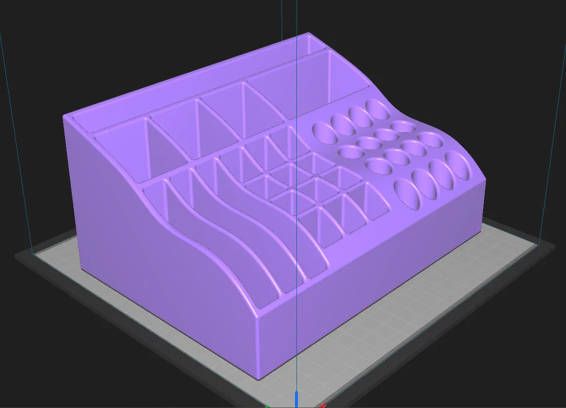 Dụng cụ sắp xếp đồ trang điểm cho 'bả'. Mục đích là để đựng bảng màu ở phía sau, các lỗ nhỏ cho cọ, ô vuông lớn cho kem nền, v.v. Tôi đã in mẫu này bằng nhựa PETG trong suốt với độ điền đầy 10% và chiều cao lớp là 0.28 mm.