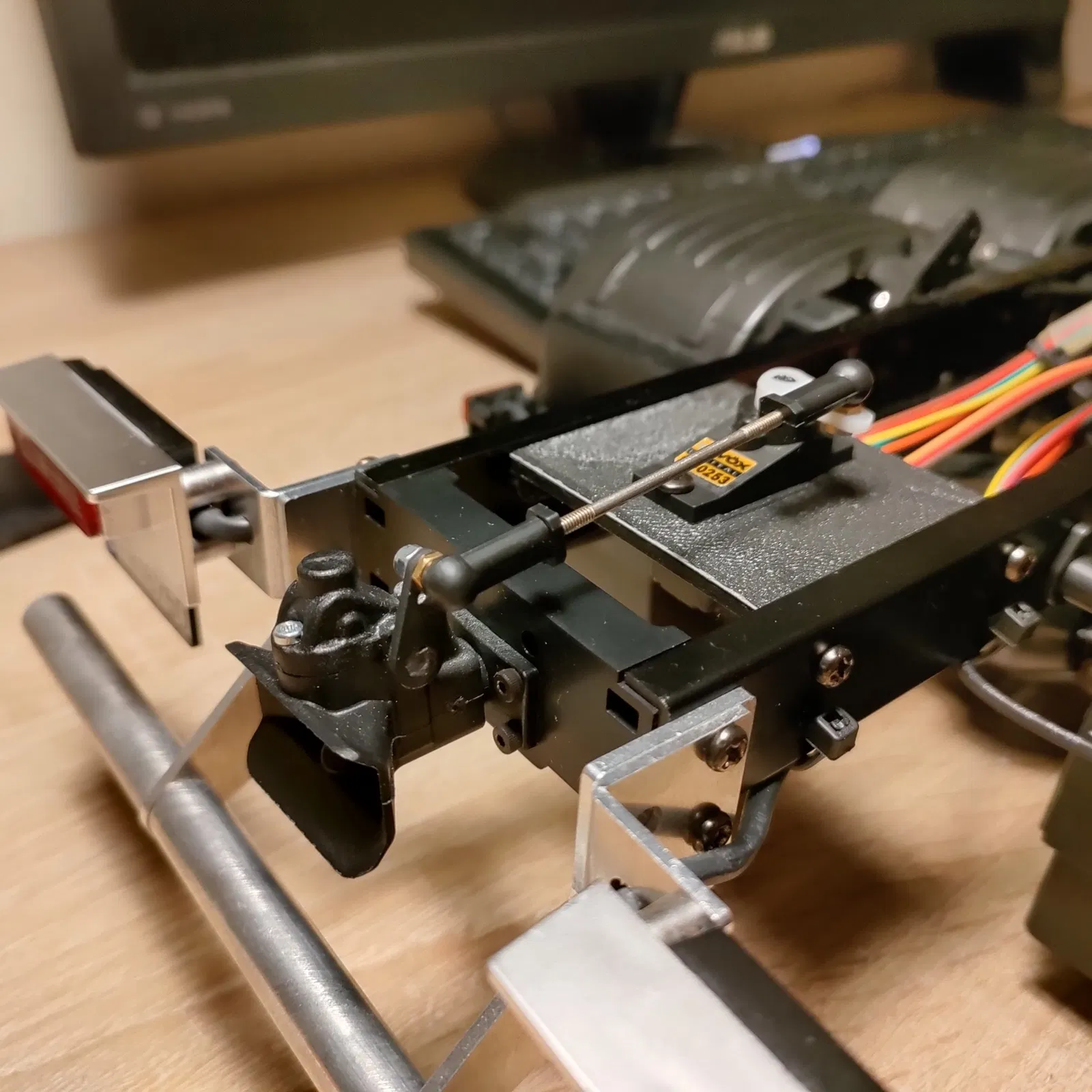 Tôi sử dụng một servo vi mô Savöx SH-0253 và thanh chuyển từ bộ kit xe tải gỗ Tamiya Volvo FH16.