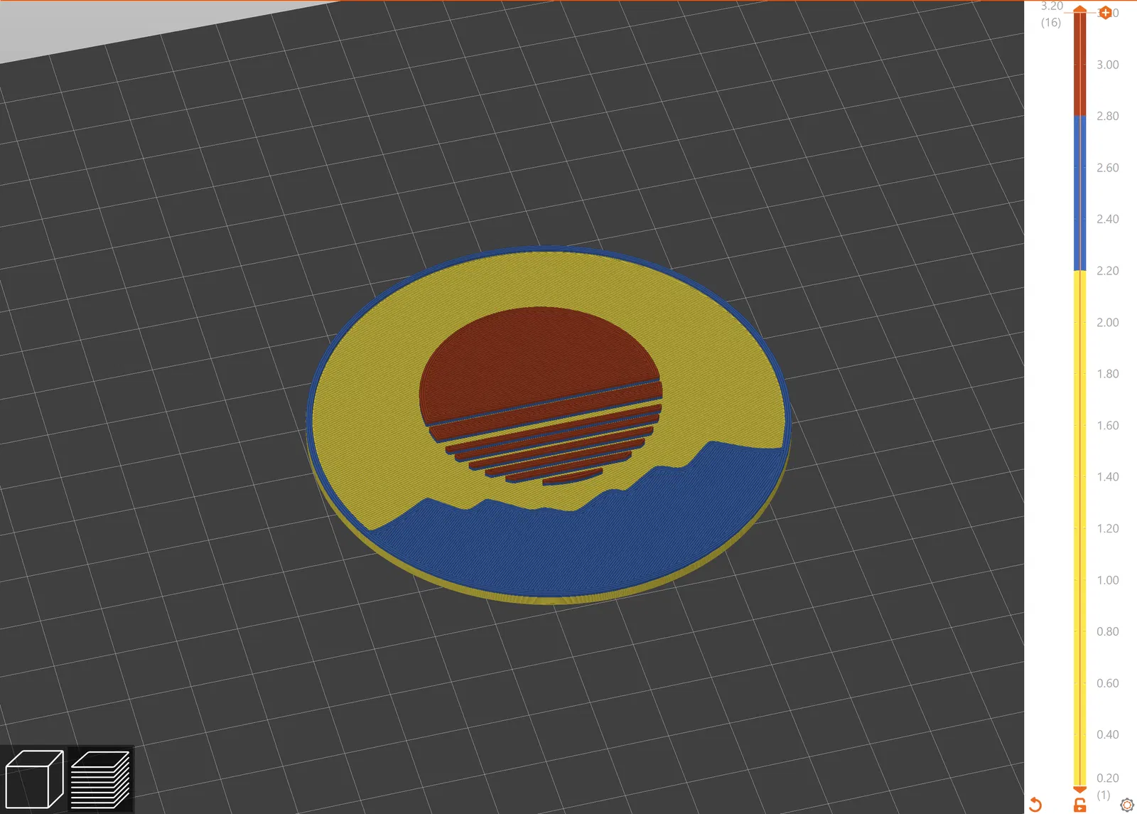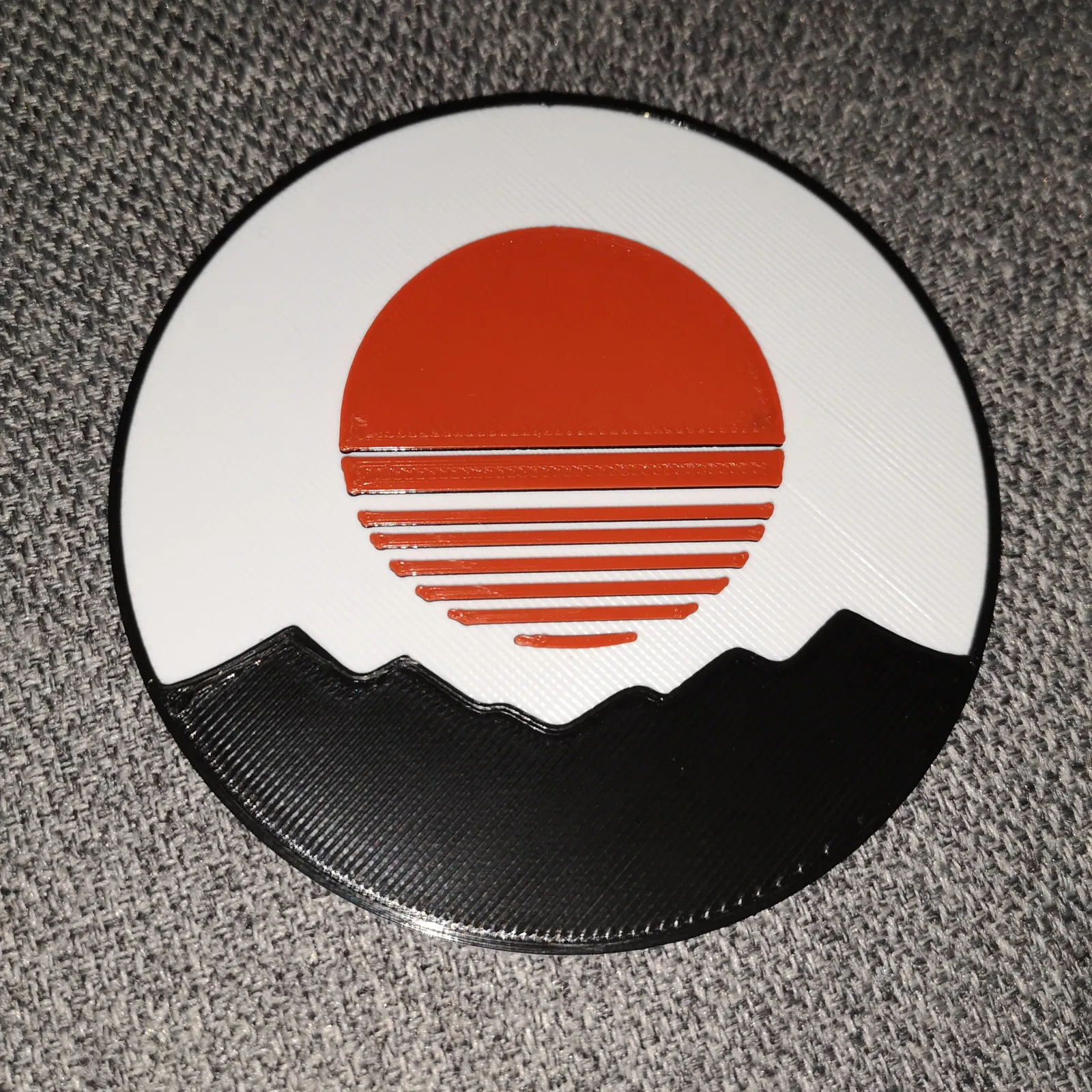 Mẫu in 3D "Hoàng Hôn Nhật Bản với Núi" này dùng kỹ thuật M600 để tạo hiệu ứng đa sắc, rất hợp để làm tấm lót bàn. Hướng dẫn chi tiết về các màu sợi và thông số in được cung cấp.