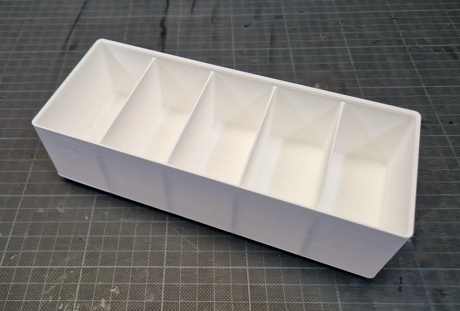 Hộp đựng giấy nhám theo chuẩn Gridfinity, với kích thước 5x2 ô. Thiết kế này giúp bạn lưu trữ và sắp xếp các khối giấy nhám một cách gọn gàng và khoa học, tối ưu hóa không gian trên bàn làm việc hay trong xưởng của bạn.