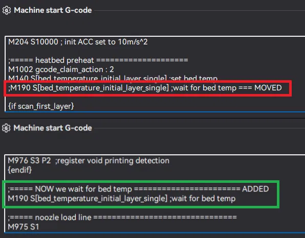 Tôi chỉ đơn giản di chuyển M190 để nó xảy ra sau khi phun filament, lau vòi phun, định vị gốc tọa độ (homing), cân mặt bàn, v.v. Tôi đã di chuyển nó đến ngay trước "noozle load line" (dòng 256-257), diễn ra trước khi hiệu chuẩn dòng chảy và các đường phun thử, vì vậy nó sẽ vẫn đảm bảo bàn nhiệt nóng hoàn toàn trước khi bất kỳ filament nào chạm vào mặt bàn in.