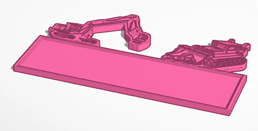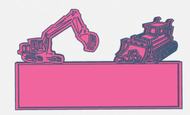 Bảng tên theo chủ đề xây dựng với hình ảnh xe ủi và máy xúc, thích hợp để trang trí tường hoặc làm bảng hiệu. Có thể thêm tên bé hoặc người thân theo phong cách 3D hoặc vẽ tay.