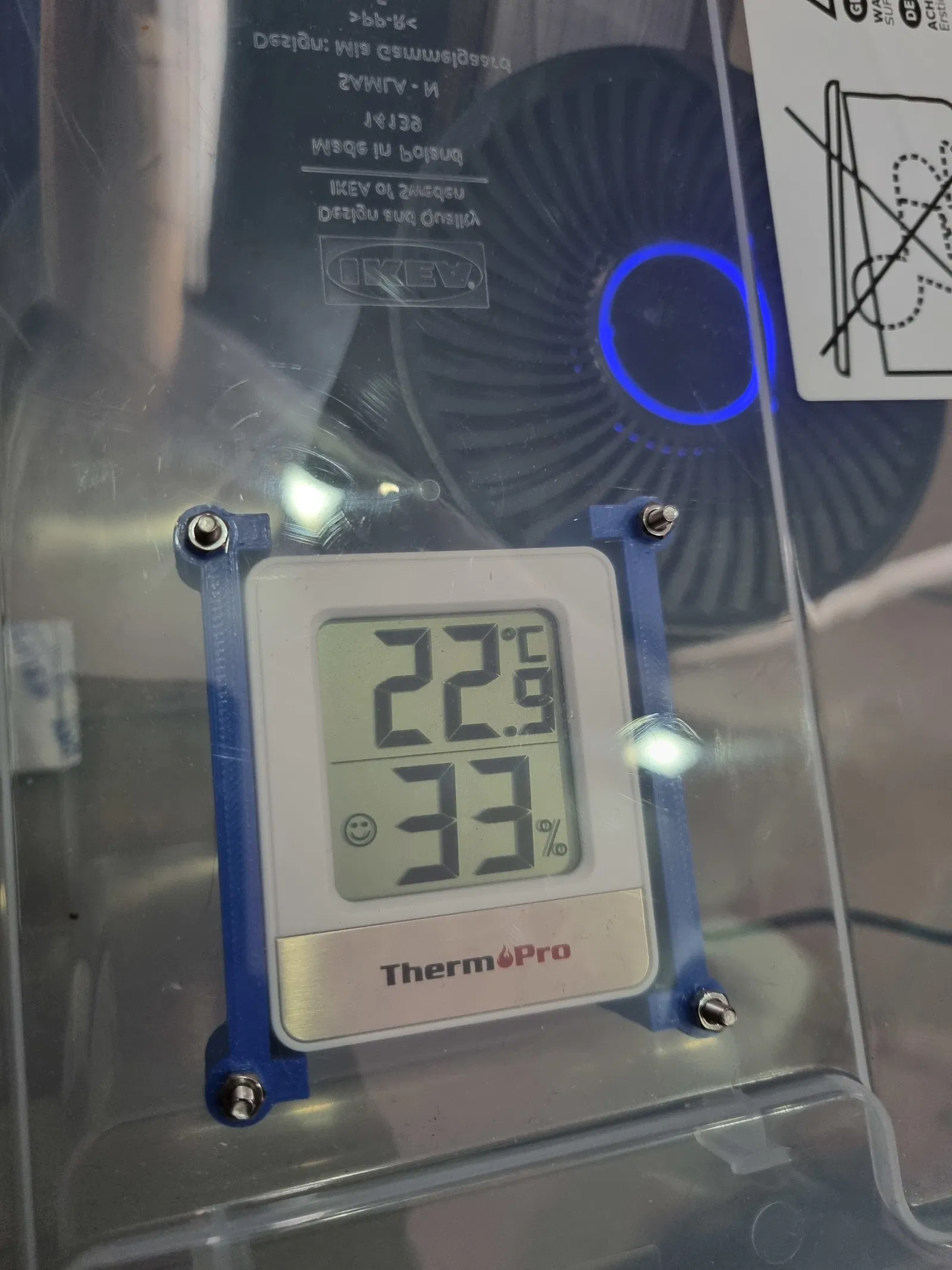 Cái kẹp giữ cho nhiệt ẩm kế ThermoPro, xài trong hộp đựng filament khô để đo nhiệt độ, độ ẩm. Gắn lên nắp hộp đựng trong suốt nha. Cần 4 ốc M3x25 và 4 đai ốc M3 để lắp.