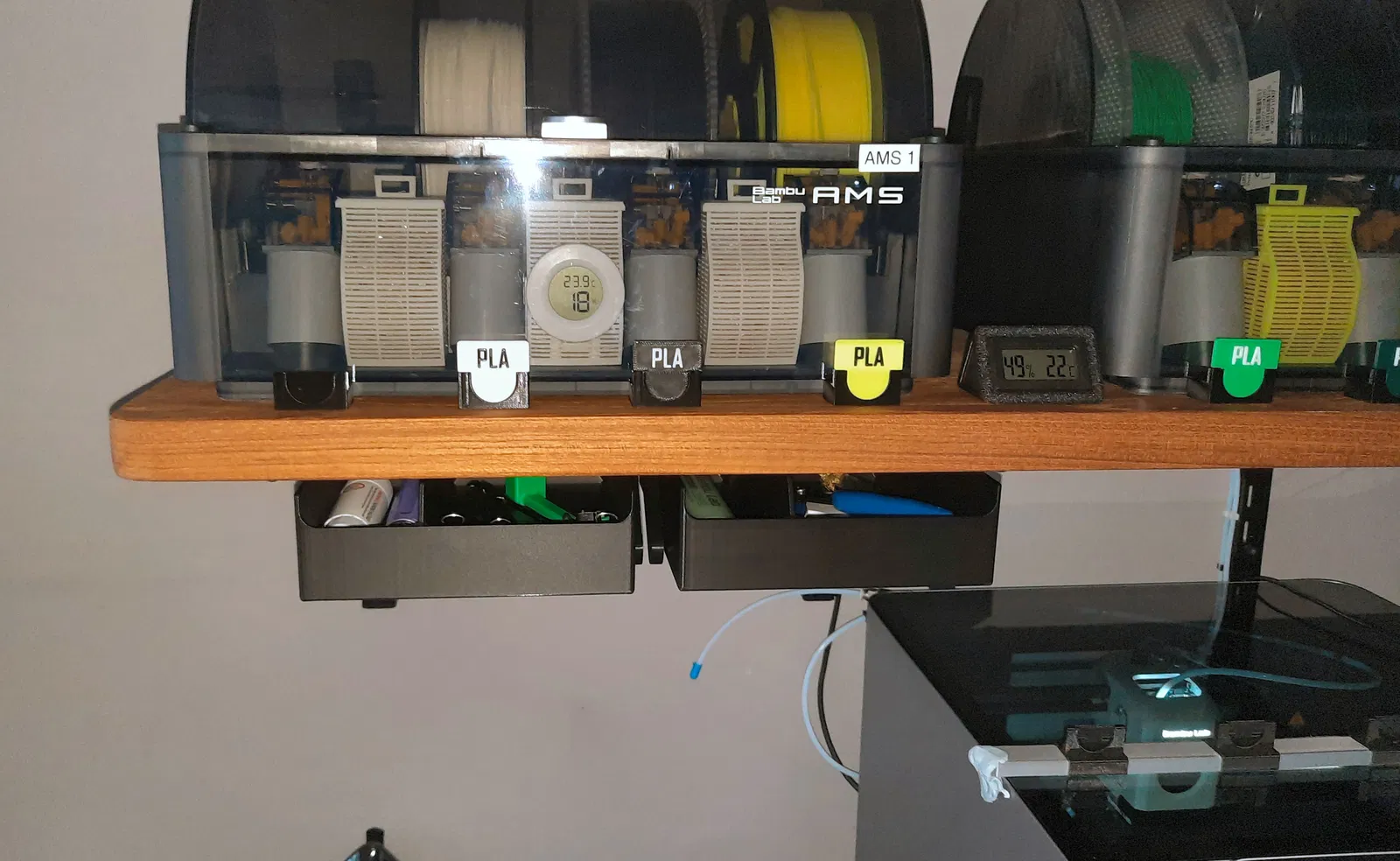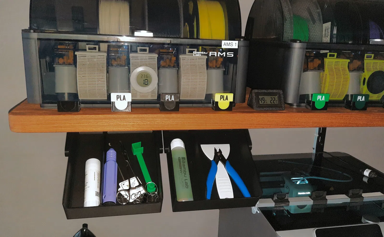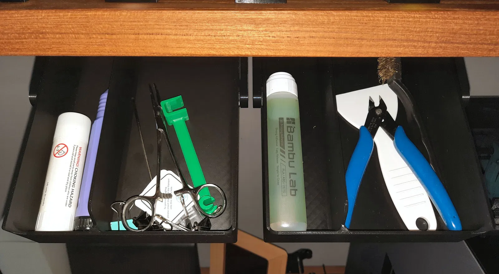 Sau khi in thử và bắt vít vô chỗ cần gắn, tui hài lòng lắm. Nhưng mà có một món đồ của tui (cái nhíp) cứ bị tuột ra tuột vô phía sau hộc tủ hoài. Cái này không hẳn là lỗi thiết kế đâu. Chỉ là cái thành sau của hộc tủ nó phải khoét thấp xuống để cho hộc tủ có thể nghiêng xuống được. Nó làm mất phần trên của thành sau, nên dễ bị mấy ông vụng về như tui làm rớt đồ ra ngoài!