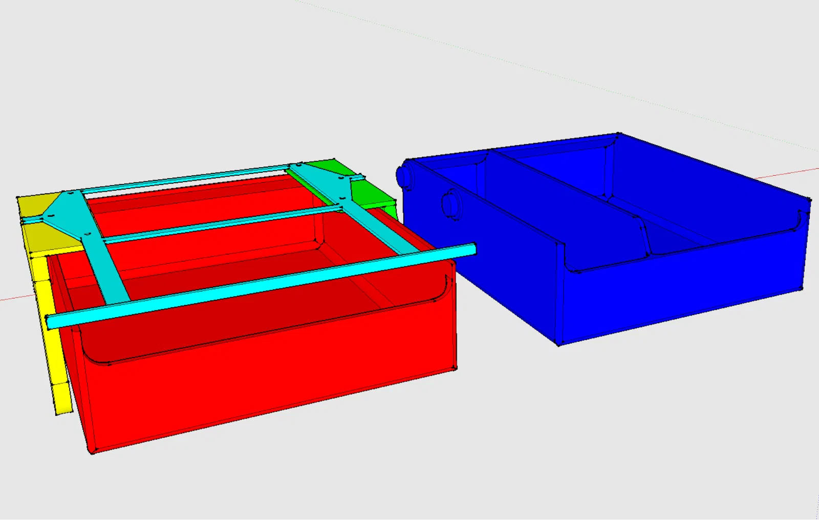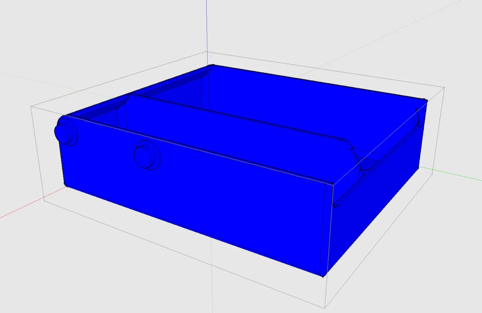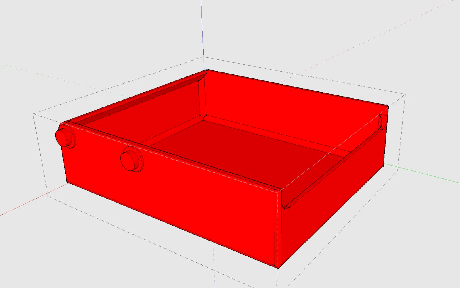 Tui cũng không thích cái vụ mà không có điểm báo rõ ràng là hộc tủ đã đóng hết cỡ, với lại cảm giác chạy ray nó hơi bị "lỏng lẻo" nói chung. Tui thêm hai cái gờ nhỏ ở đáy mỗi cái ray để giải quyết cái vụ thứ nhất, và thêm một cái gờ nhỏ trên mỗi cái chốt trượt để nó làm bề mặt tiếp xúc thay vì thành hộc tủ.