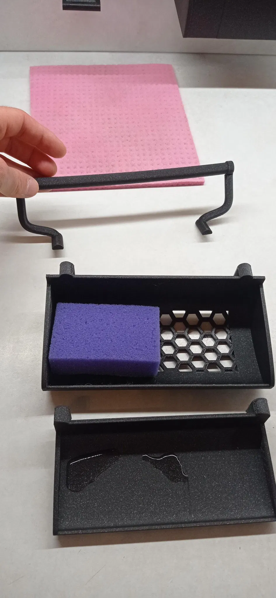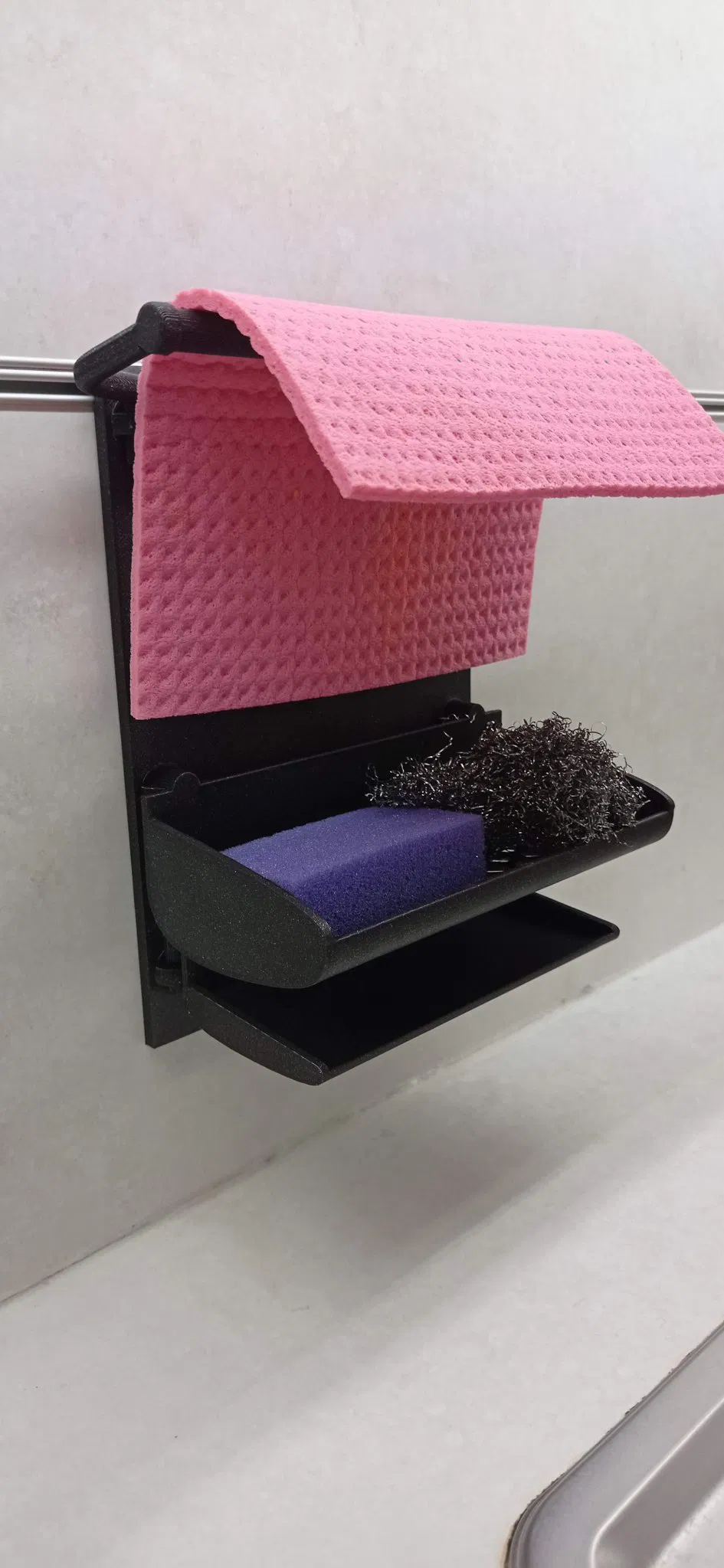 Giá đỡ đặc biệt và thanh lịch cho các loại bọt biển khác nhau dùng để rửa chén, giúp giữ chúng cách xa bề mặt. Được mô hình hóa thành các phần để dễ in và dễ rửa sạch.