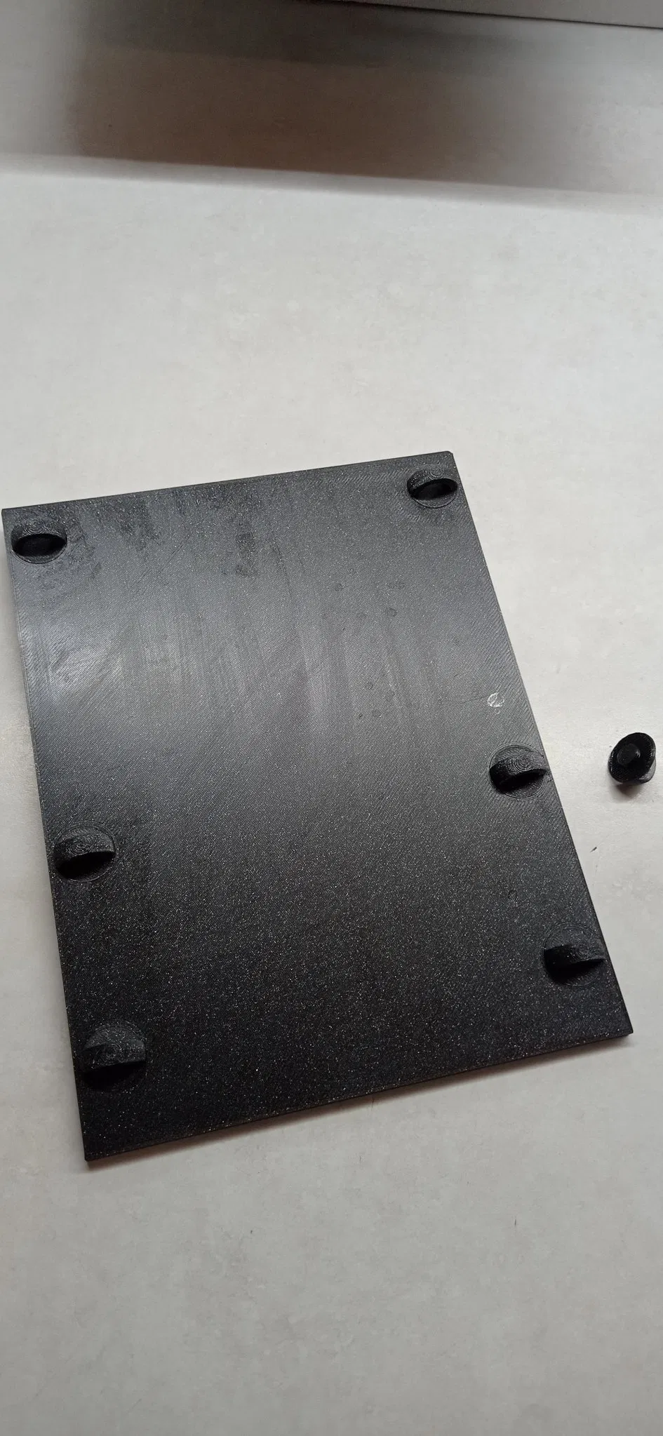 - Bàn chính: mặt trước quay xuống để có bề mặt sạch đẹp. Thêm hỗ trợ hữu cơ cho tấm xây dựng cho các lỗ vít. Bạn có thể bỏ qua phần móc. 10% độ đầy là ổn, bạn có thể chơi với độ đầy cao hơn xung quanh các lỗ khoan (thêm 6 bộ điều chỉnh hình trụ tương ứng được đặt tại các lỗ và có đường kính hơi lớn hơn, độ đầy 40-70% cho phần chắc chắn hơn khi vặn núm vào chúng).