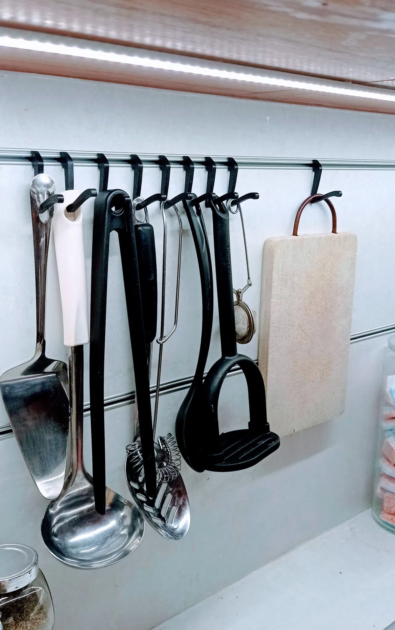 Một cái móc vào thanh nhôm tích hợp của tường nhà bếp. Giải pháp thanh lịch và rất rẻ!