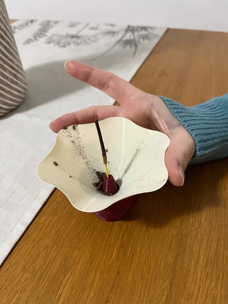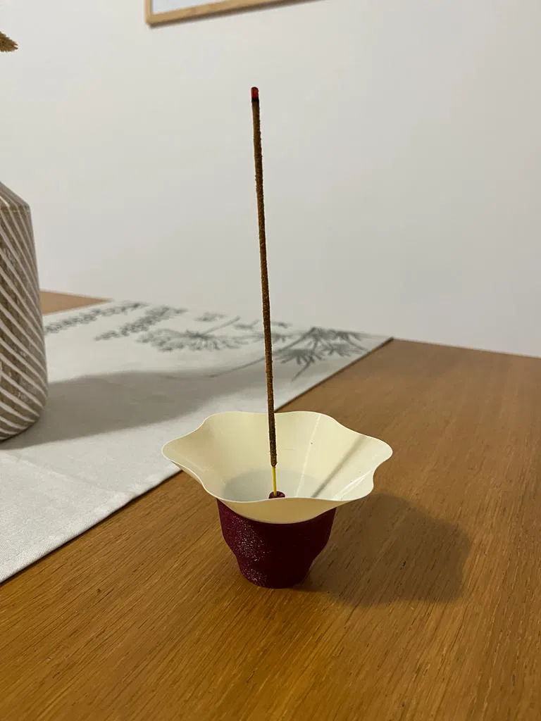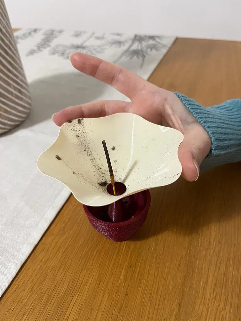 Đây là một người giữ hương hai mảnh đơn giản: phần trên được thiết kế để ngăn hương rơi xuống đất, trong khi phần dưới giữ thanh nhang và thu thập tro. Bằng cách nâng phần trên, tro rơi vào khoang dưới, giữ mọi thứ gọn gàng. Tôi đã thêm làn da mờ để che giấu các đường may.