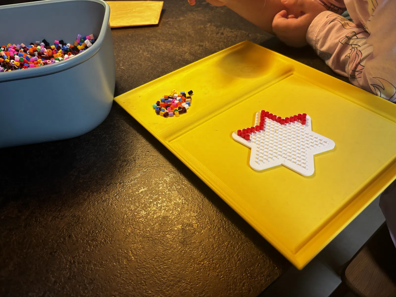 Tấm lót để chơi với hạt ủi, để không bị bay lung tung khắp phòng nữa. Tấm lót có kích thước khoảng 280 x 230 mm, kích thước phần đặt tấm ghim khoảng 160 x 190 mm. Ở cạnh có thêm ba chỗ lõm để phân loại màu sắc.