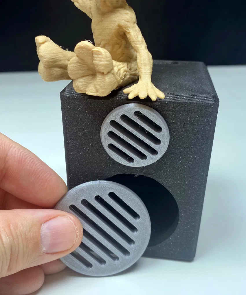 Có gì "ngầu" hơn là có "METAL GROOT" đang quẩy trên một cái loa "subwoofer" khổng lồ? Một cái loa "subwoofer" mà còn xài được như một CÁI ỐNG HÚN TIỀN! Bạn có thể "mở két" bằng cách tháo cái lưới "subwoofer" bên dưới ra :-) Chúc vui nha! Cái "box" loa "subwoofer" này cao khoảng 8cm và có một cái lỗ khoét vừa in cho tượng Groot. File .3mf được làm bằng Bambu Studio và đã bao gồm luôn cái lỗ khoét cho Groot. Làm ơn sử dụng "HEAVY METAL GROOT" của Max666: https://www.f3d.vn/3d-model/46834-groot-nho-voi-tay-kim-loai-nang-cao Tôi khuyên bạn nên in tượng Groot với kích thước 99% so với bản gốc để nó khớp hơn tùy theo cài đặt máy in của bạn. Nếu bạn thích tượng Groot, xin đừng quên "like" cho Max666 luôn nha. Cảm ơn. Vật liệu: PLA Độ dày lớp: 0,3mm hoặc tốt hơn Ruột (Infill): 15% Nếu bạn in bằng các màu khác, vui lòng đăng "MAKE" của bạn lên, cảm ơn!