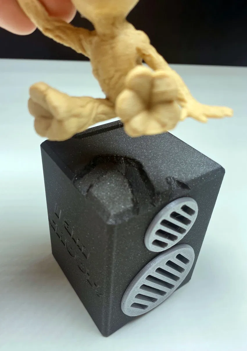 Biến loa "subwoofer" thành ống húm tiền "HEAVY METAL GROOT" độc đáo! Có chỗ khoét sẵn cho tượng Groot, cao 8cm. In bằng PLA, độ dày lớp 0,3mm, ruột 15%. Nhớ "like" cho Max666 nha!
