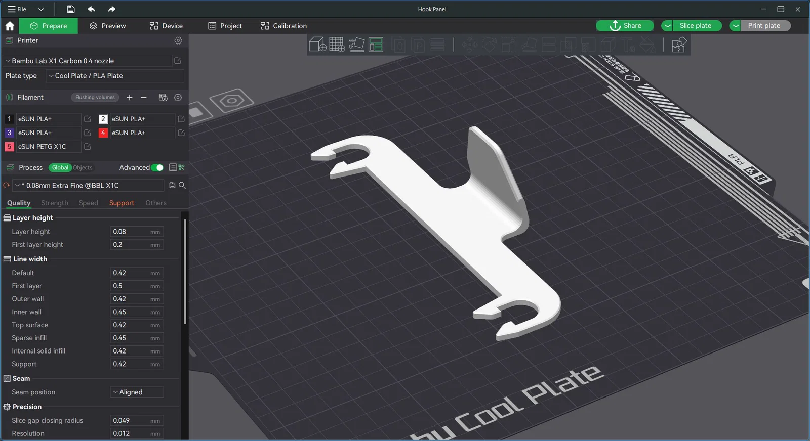 Chiếc móc treo này được in bằng PLA+. PETG cũng có thể là một lựa chọn nhựa tốt. Tôi e rằng PLA tiêu chuẩn có thể quá giòn ở khu vực kẹp trụ đỡ. Nếu bạn thử dùng PLA, hãy cho tôi biết kinh nghiệm của bạn.
