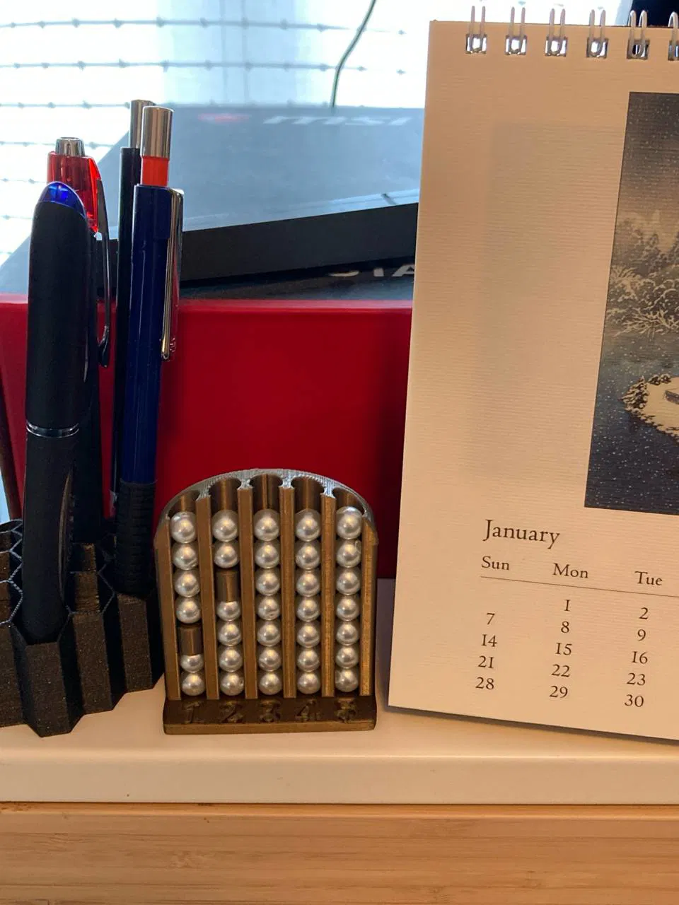 Một cách đơn giản và thanh lịch để theo dõi các thói quen mới. Dùng nó như một bộ đếm hàng tuần cho tối đa năm thói quen hoặc bộ đếm hàng tháng cho một thói quen (trong trường hợp này, các số là cho mỗi tuần). Mỗi ngày bạn thành công, hãy thêm một hạt hoặc bộ đếm.