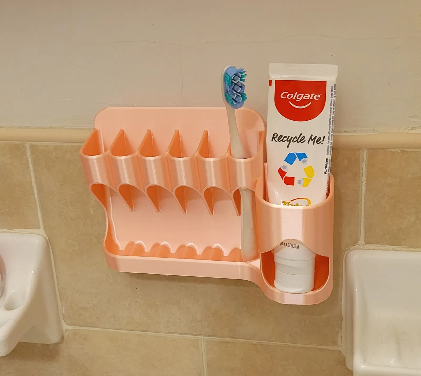 Kệ đựng bàn chải đơn giản, để được 6 bàn chải và kem đánh răng. Có thể tháo rời để vệ sinh dễ dàng. Gắn tường bằng miếng dán Command Strip, in không cần support.