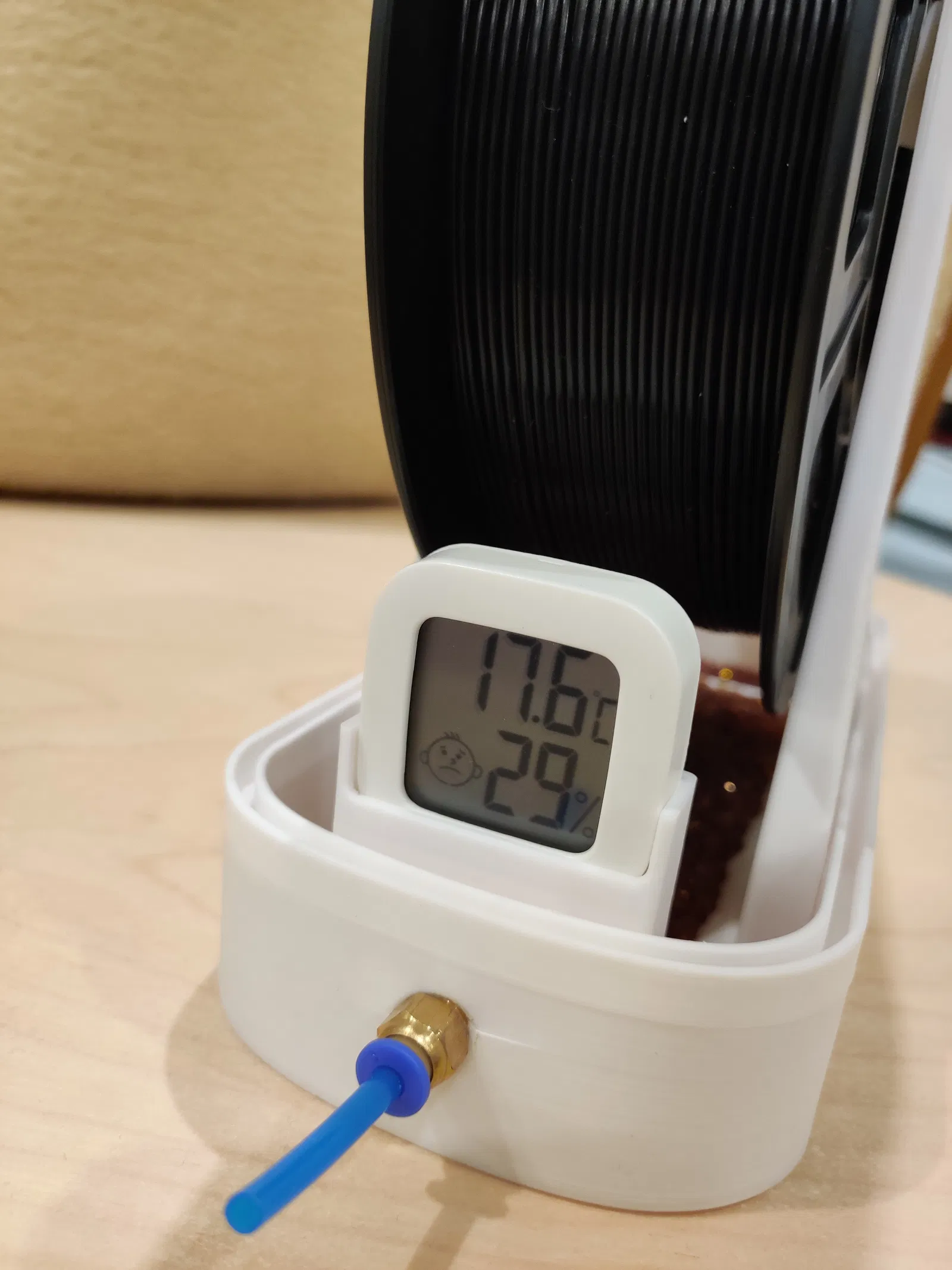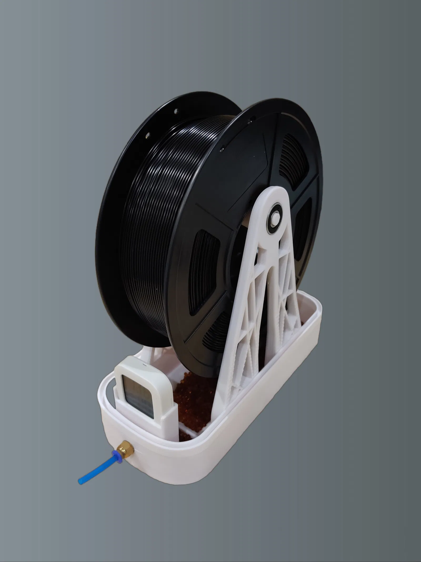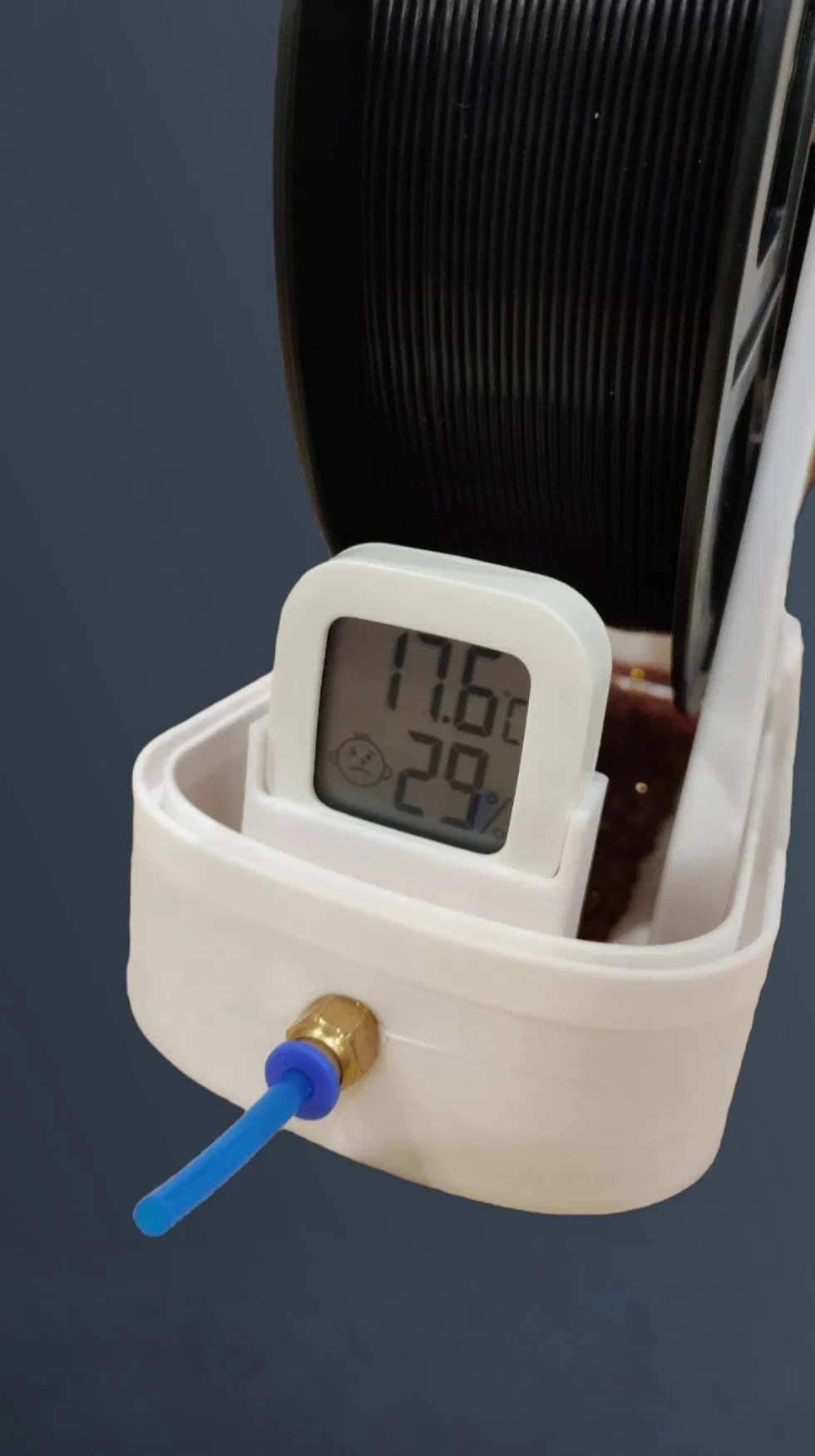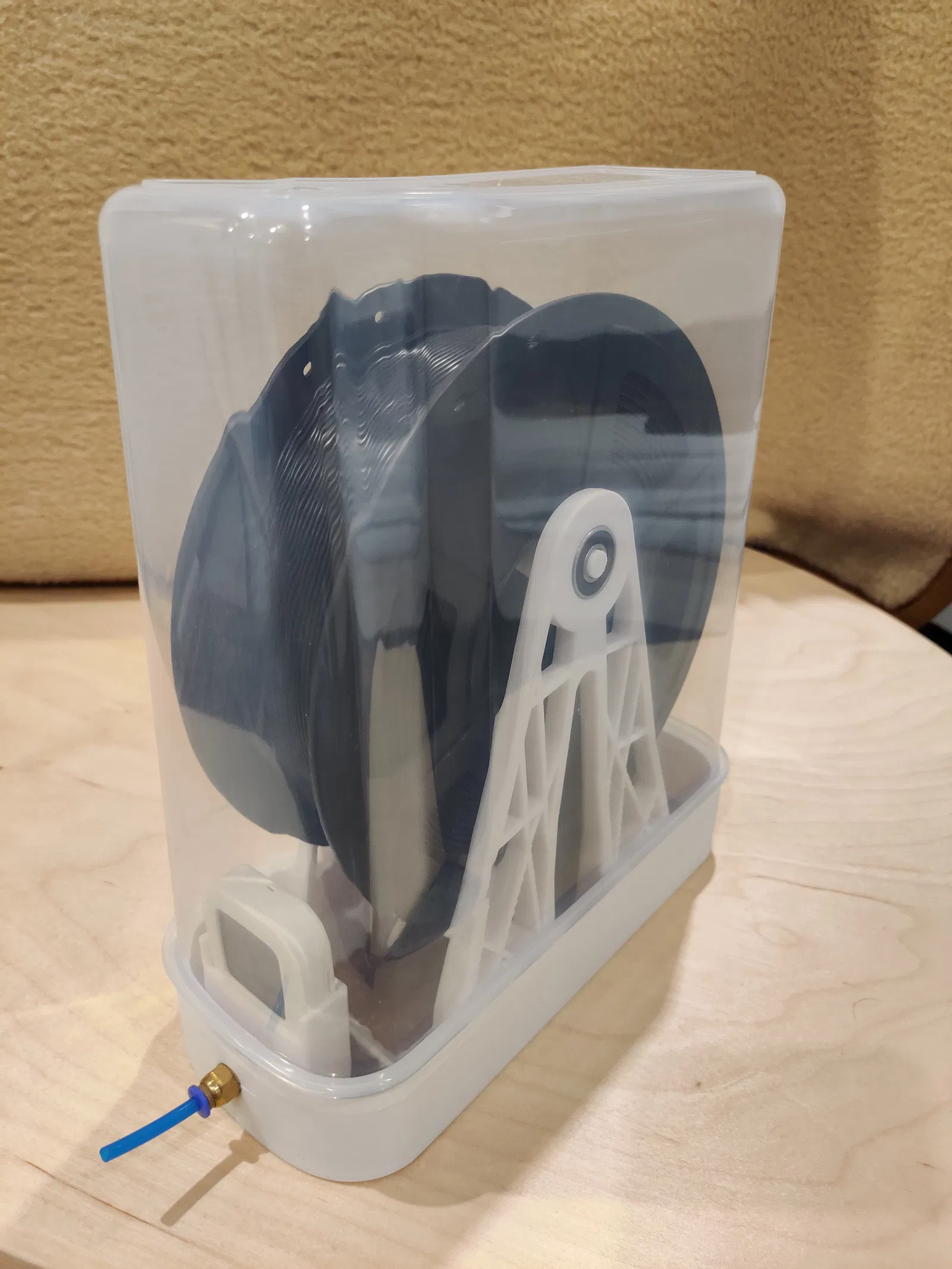 Lần đầu thử sức thiết kế hộp giữ khô filament, dùng gel hút ẩm và ẩm kế để bảo quản cuộn filament tốt hơn. Có thể tùy chỉnh để không cần bạc đạn.