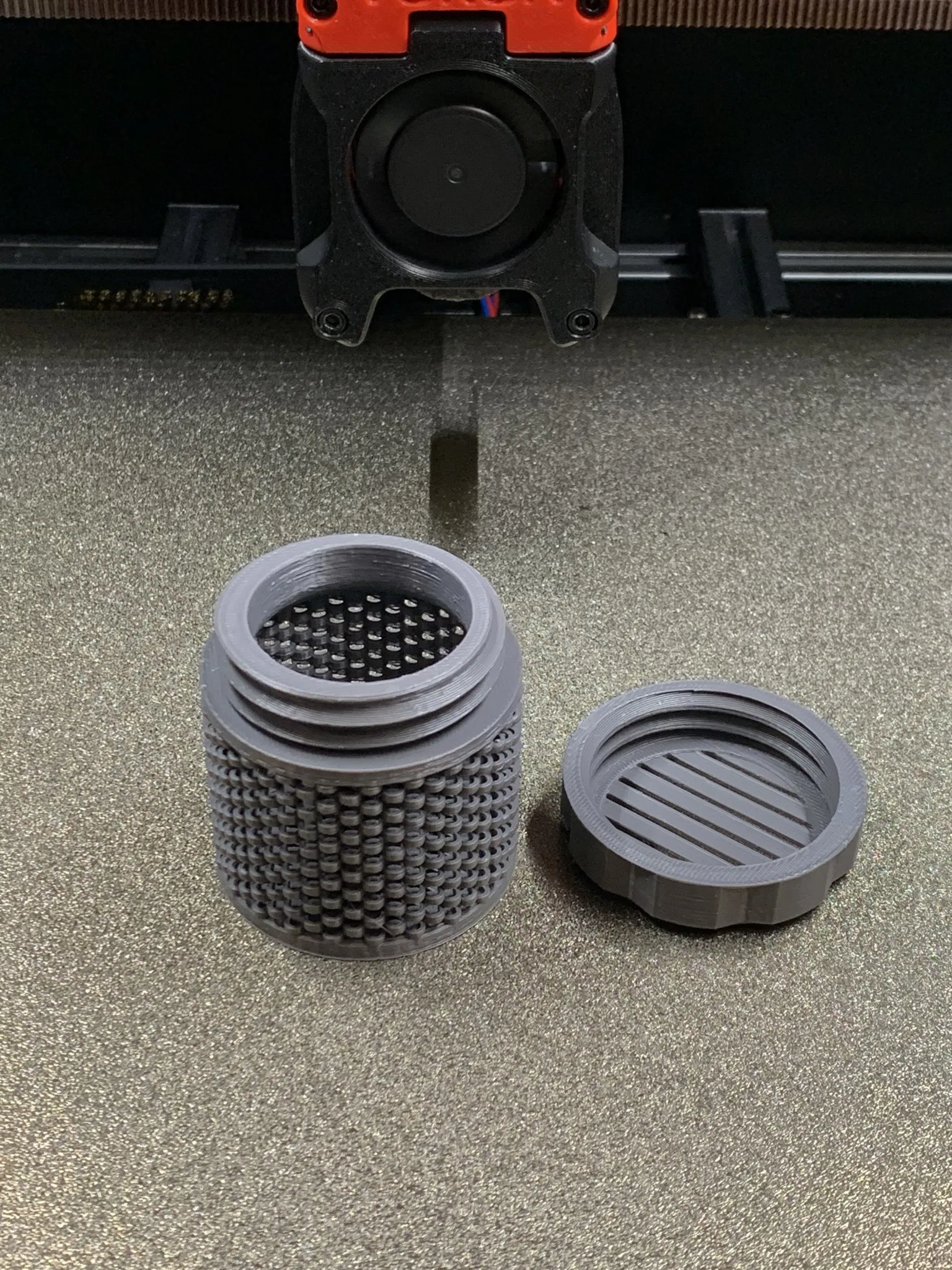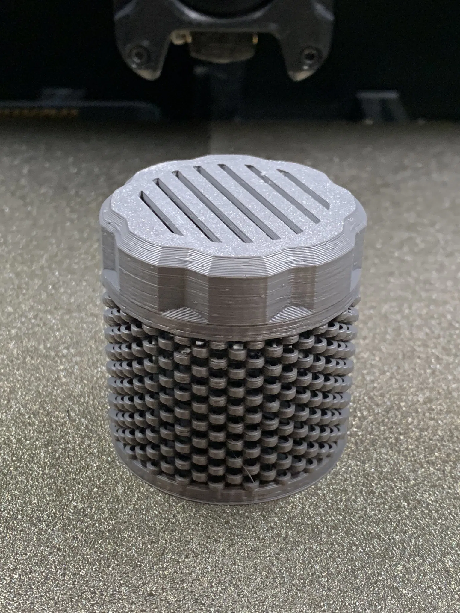 Thời gian in của tôi là 1:20 cho cả thùng chứa và nắp, vì vậy kiểu dệt giỏ thực sự tiết kiệm thời gian.