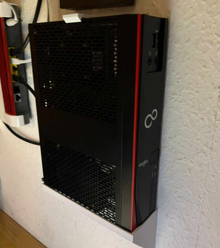 Giá đỡ đơn giản dùng để treo máy tính mỏng FUJITSU FUTRO S940 lên tường. Bạn chỉ cần 3 con vít chìm 4mm dài ít nhất 50mm và chốt tương ứng. Đảm bảo căn chỉnh khi in để móc phía trên chịu lực tốt.
