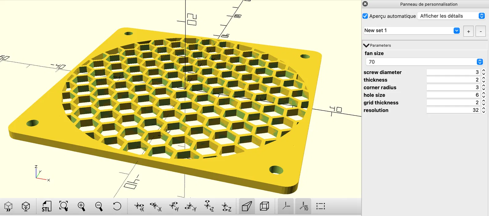 Cái lưới tản nhiệt quạt (fan grill) theo tham số này cho phép bạn tạo ra các lưới tản nhiệt quạt với mọi kích cỡ tiêu chuẩn, giữ nguyên phong cách thiết kế. Bạn chủ yếu chỉ cần chọn kích thước quạt, độ dày của lưới và tạo ra file STL bằng OpenSCAD. Bạn cũng có thể điều chỉnh kích thước của lưới hình lục giác và đường kính của lỗ bắt vít.