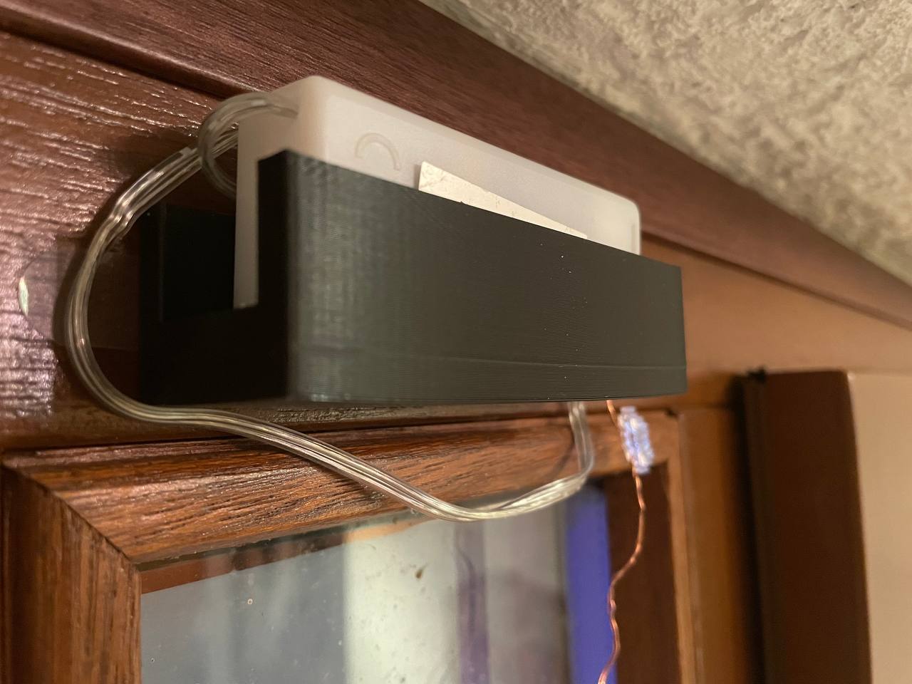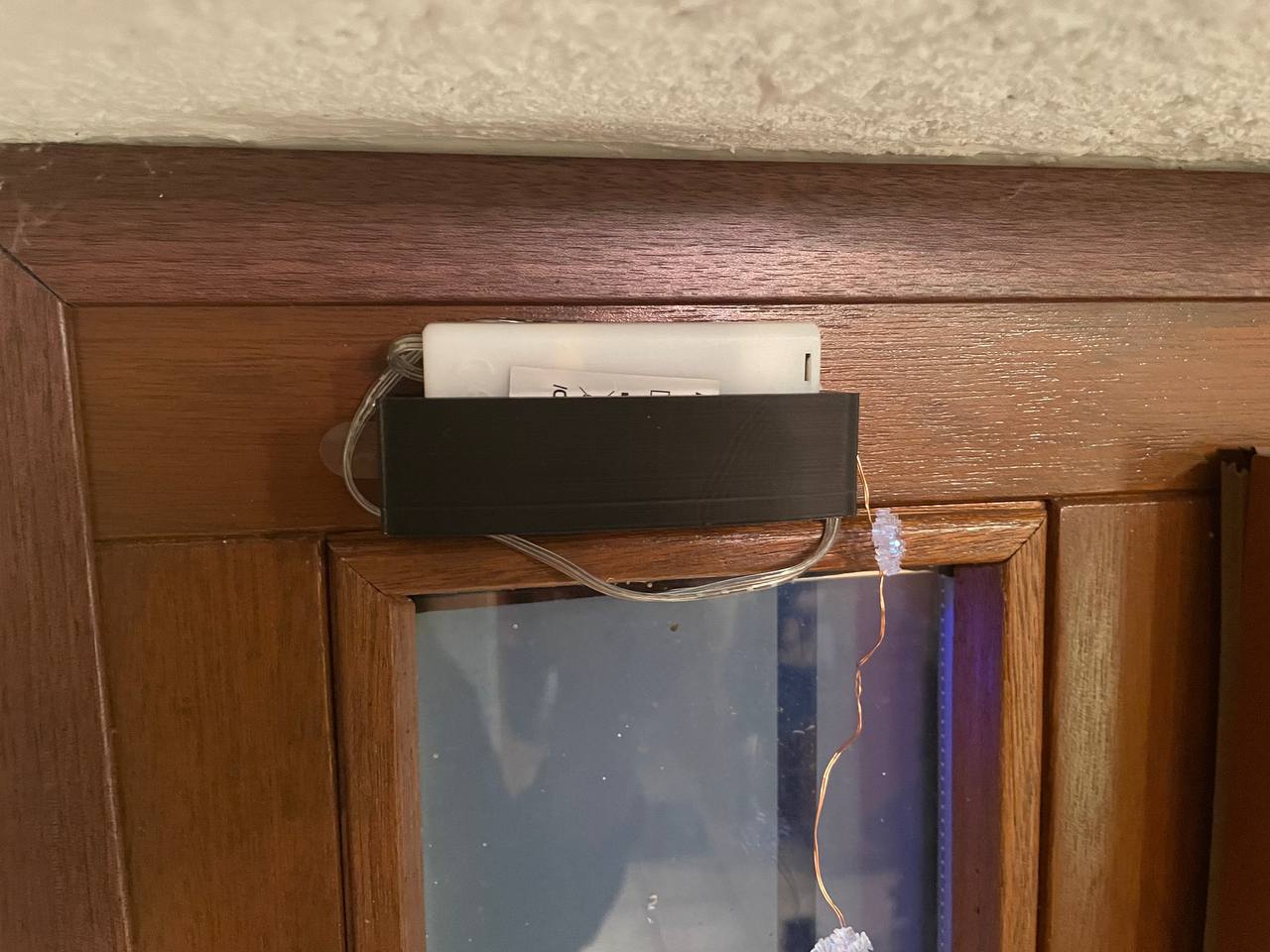 Nhà tui có mấy cái đèn này cho mấy dịp khác nhau như Halloween, Lễ Phục Sinh hay Giáng Sinh, mà tui hổng muốn gắn cố định cái hộp pin vô cửa nên tui tạo ra cái đế này. Giờ cái đế này dán lên cửa bằng băng keo, nên là mình có thể thay nguyên cái đèn dây bằng cách thay cái hộp pin vô đế thôi.