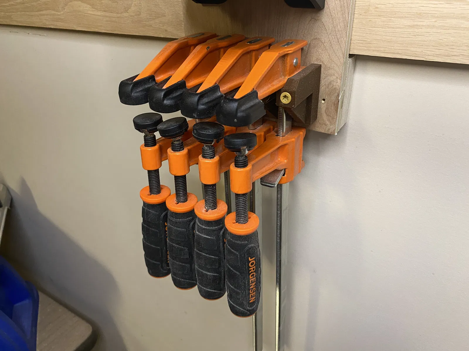 Tui thiết kế cái này để làm cái giá treo tường, để giữ được 4 cái kẹp f hiệu Jorgensen. Cái khe mà cái kẹp nó nằm vô thì theo cái đường cong của kẹp luôn, nên nó không có rớt ra được. Tui đang treo nó trên cái tường French Cleat, nhưng mà bạn cũng có thể treo trực tiếp lên tường, hoặc gắn lên tủ đồ nghề hay bàn làm việc cũng được. Đây là một trong mấy cái giá để đồ nghề mà tui tự thiết kế để dọn dẹp cái gara cho gọn gàng với có thêm không gian xài!