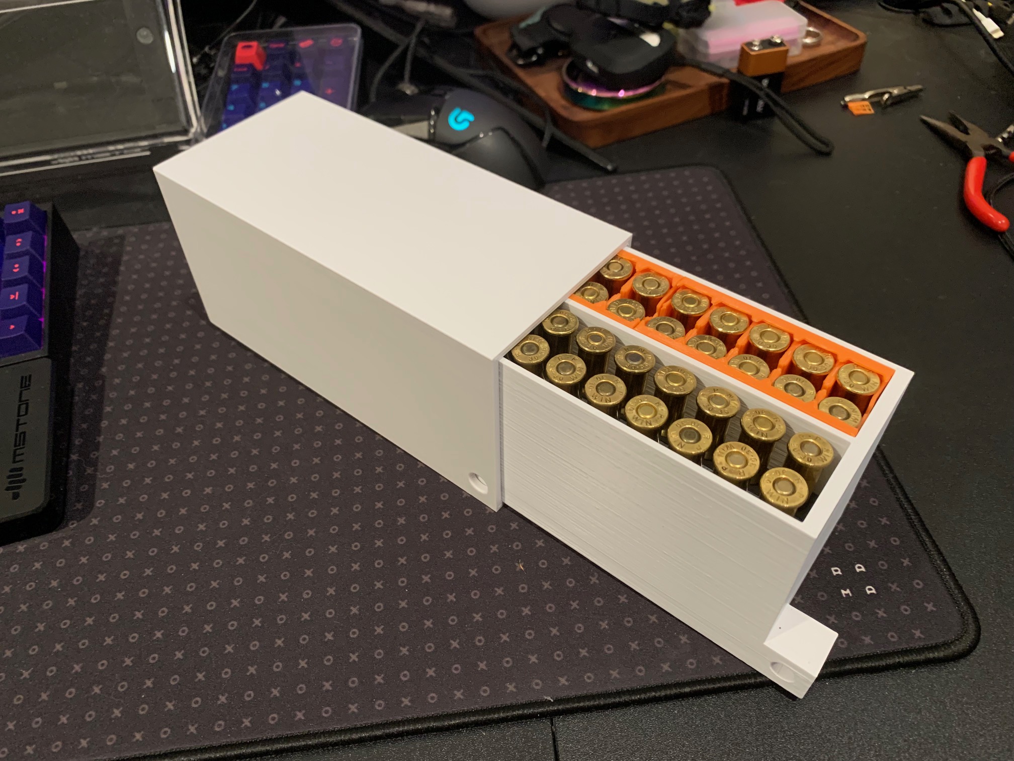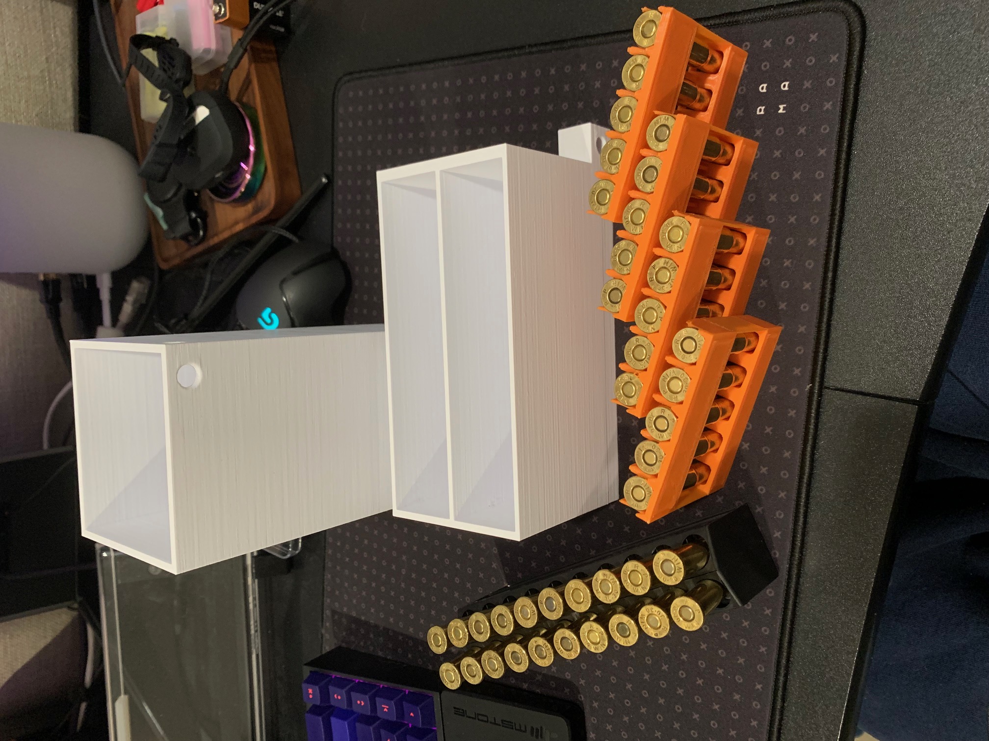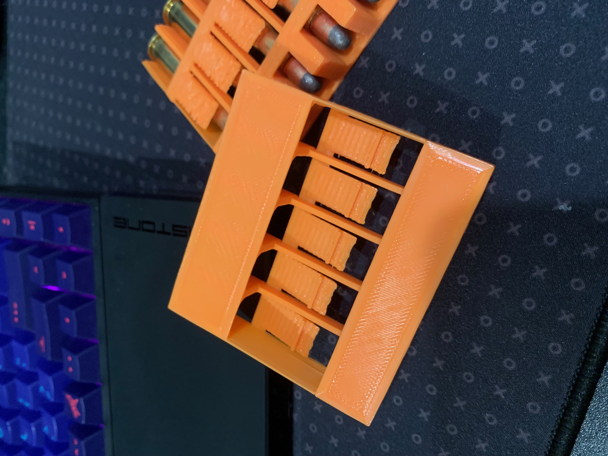 Kẹp đạn 5 viên cho đạn .30-30, được làm lại cho gọn hơn và tương thích với hộp khóa 30-30 của người dùng. In với support, mặt "lẫy" úp xuống. PLA hoặc PETG đều dùng được.