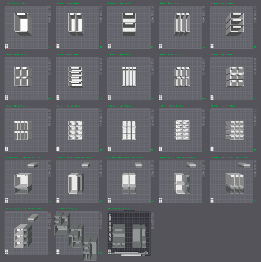 Nếu bạn thích mẫu này và không phiền lắm, xin hãy bấm nút ❤ - nó giúp ích rất nhiều 😀 Đây là các khay lồng cho Hộp Đựng Đồ Nghề Cỡ Trung Bình 20 Ngăn Harbor Freight. Tôi đã tạo ra một loạt các hộp bằng cách sử dụng tệp khay lồng tham số của spuder. Thậm chí còn có một vài hộp có kích thước lạ! Xin lưu ý, các khay lồng này chỉ dùng được cho các hộp lớn và trung bình. Chúng KHÔNG vừa với các hộp nhỏ. Nếu bạn đang tìm khay lồng cho hộp nhỏ, tôi đã tải lên ở đây: Khay Lồng Phụ Kiện Harbor Freight - Hộp Nhỏ. Tôi khuyên bạn nên sử dụng các tệp .3mf thay vì tệp STL. Có các tấm cho mỗi loại hộp lồng được bố trí trong một định dạng hộp đơn để bạn có thể hình dung các khay lồng trông như thế nào. Nếu bạn sử dụng tệp STL, quy ước đặt tên như sau: [SỐ-LƯỢNG-KHAY]-[số-lượng-khay-dài]x[số-lượng-khay-rộng].stl 6-boxes-3x2.stl - những hộp này tạo ra tổng cộng 6 khay với 3 khay dài và 2 khay rộng [SỐ-LƯỢNG-KHAY]-boxes-[SỐ-LƯỢNG-KHAY-DÀI]x[SỐ-LƯỢNG-KHAY-RỘNG]-[DOUBLE-???].stl 9-boxes-3x3-double-long.stl - 9 khay có kích thước 3 dài x 3 rộng với 2 khay được gộp lại với nhau để làm cho nó dài gấp đôi Tôi đã ghi lại mọi thứ trên trang Khay Lồng Hộp Đựng Đồ Nghề Harbor Freight của mình.