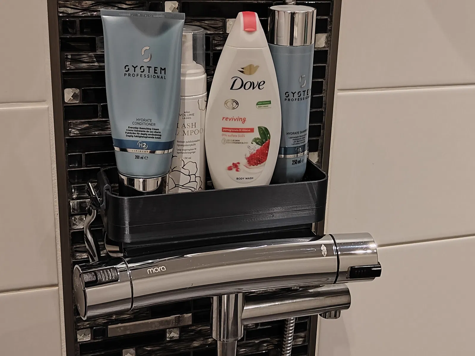 Kệ xà bông cho phòng tắm có thêm chỗ cắm dao cạo. Có file FreeCAD để tùy chỉnh đế, khay kệ in không đáy và không nắp để nước chảy qua. Phần đế và khay dính với nhau chắc chắn mà không cần ốc.