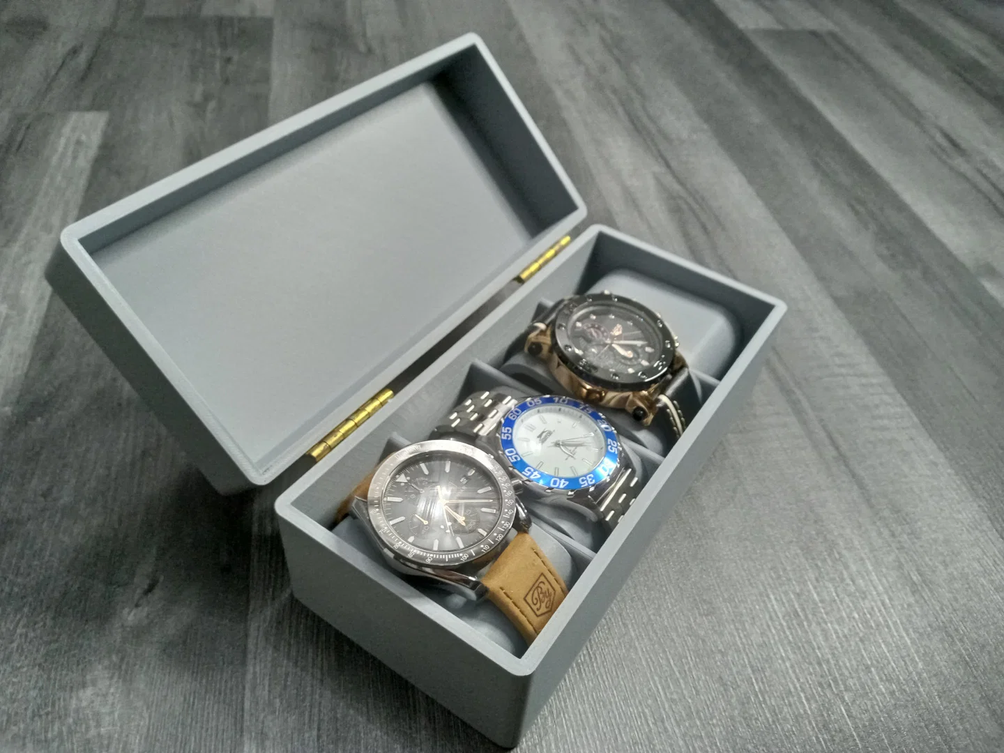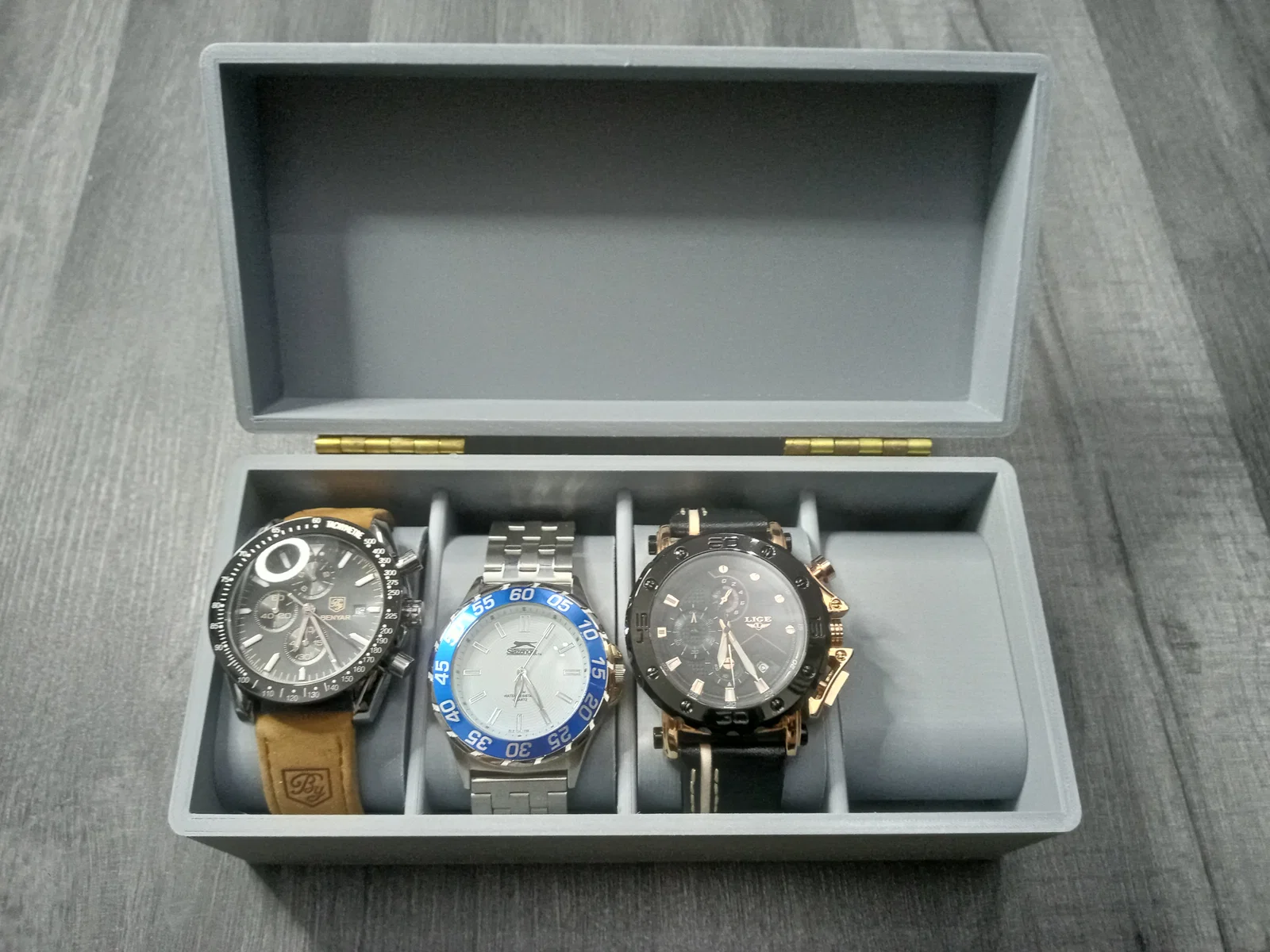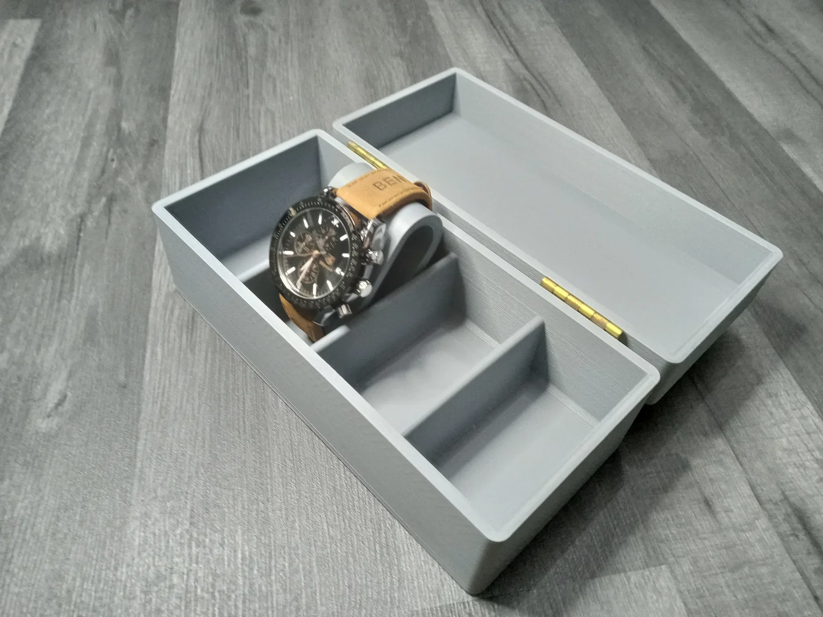 Thiết kế hộp đựng đồng hồ 4 ngăn tiện lợi, có đế dạng rãnh hoặc nguyên khối. Có thể tùy chỉnh thêm bản lề và khóa. Lưu ý điều chỉnh độ rộng trong slicer nếu thấy chật.