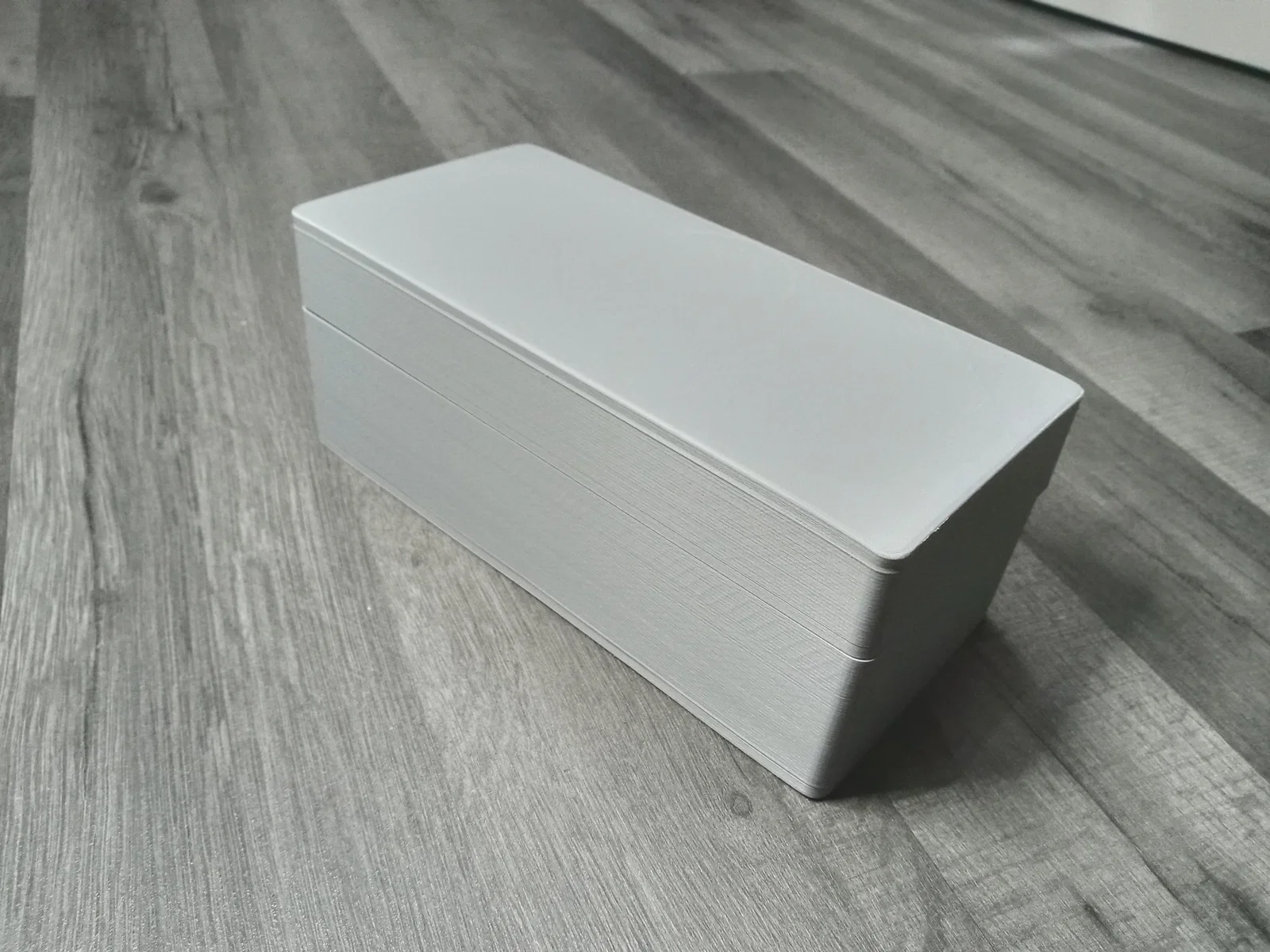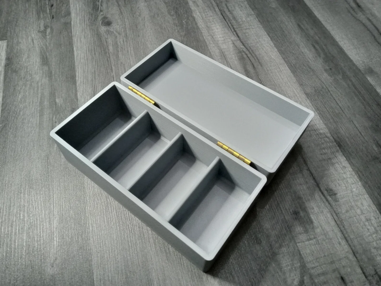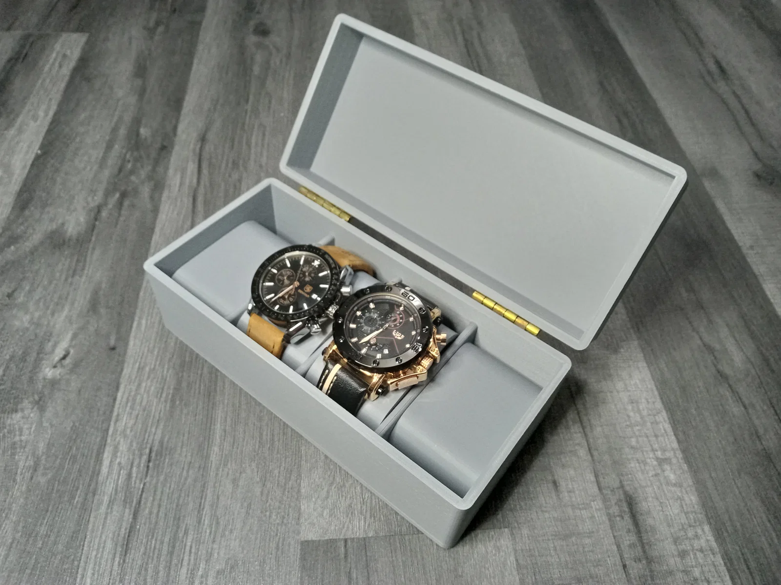 Thiết kế hộp đựng đồng hồ 4 ngăn tiện lợi, có đế dạng rãnh hoặc nguyên khối. Có thể tùy chỉnh thêm bản lề và khóa. Lưu ý điều chỉnh độ rộng trong slicer nếu thấy chật.