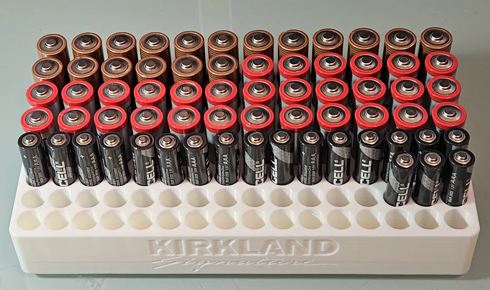 Khay đựng pin cho 48 viên pin AA và 48 viên pin AAA. Đó là số lượng bạn sẽ nhận được nếu mua một gói mỗi loại pin của thương hiệu Kirkland. Một phiên bản trơn và một phiên bản có logo Kirkland Signature ở cả hai mặt dài.