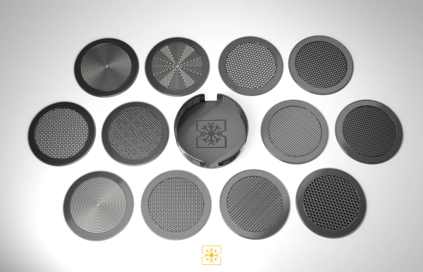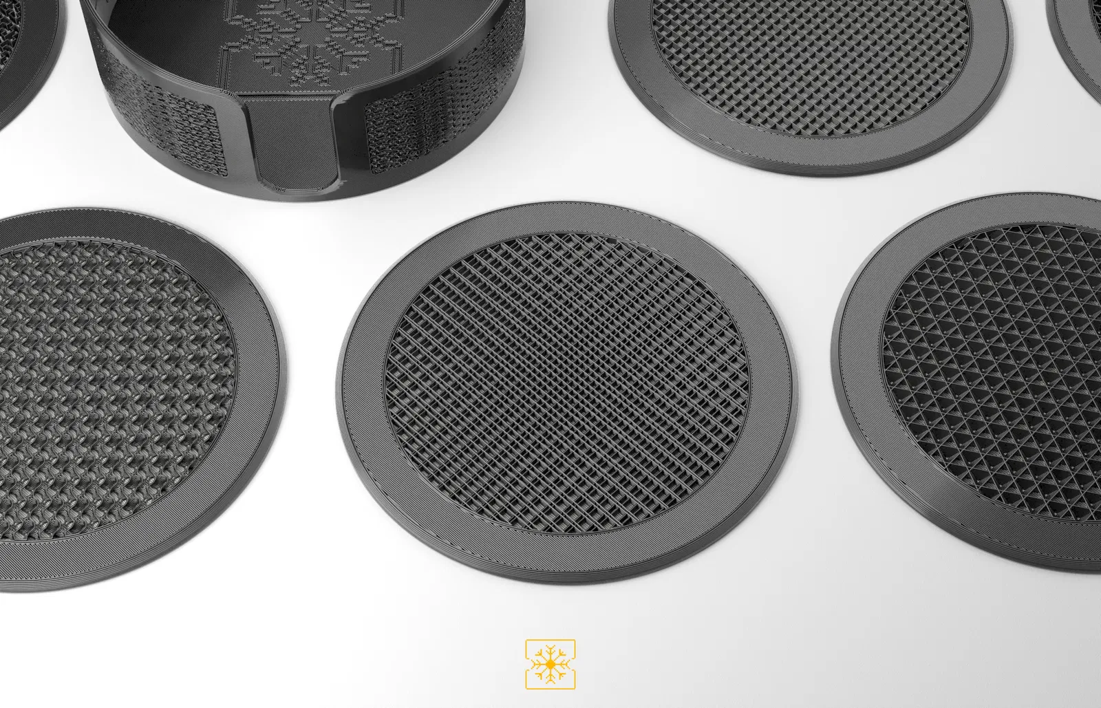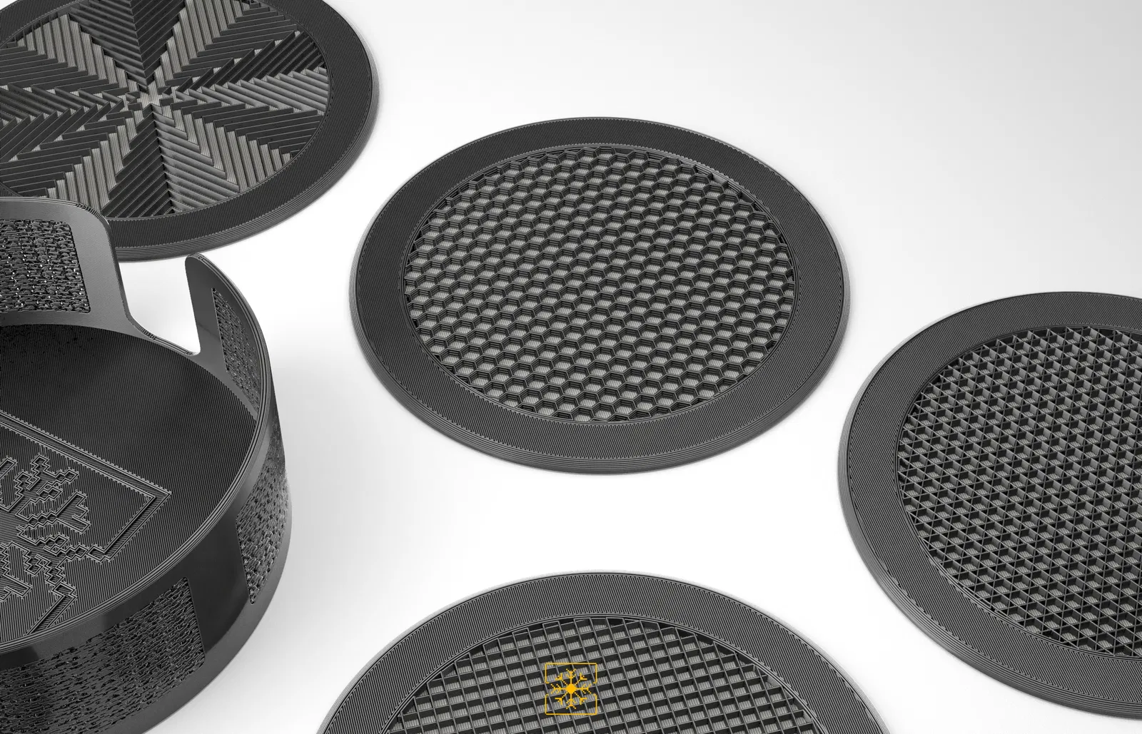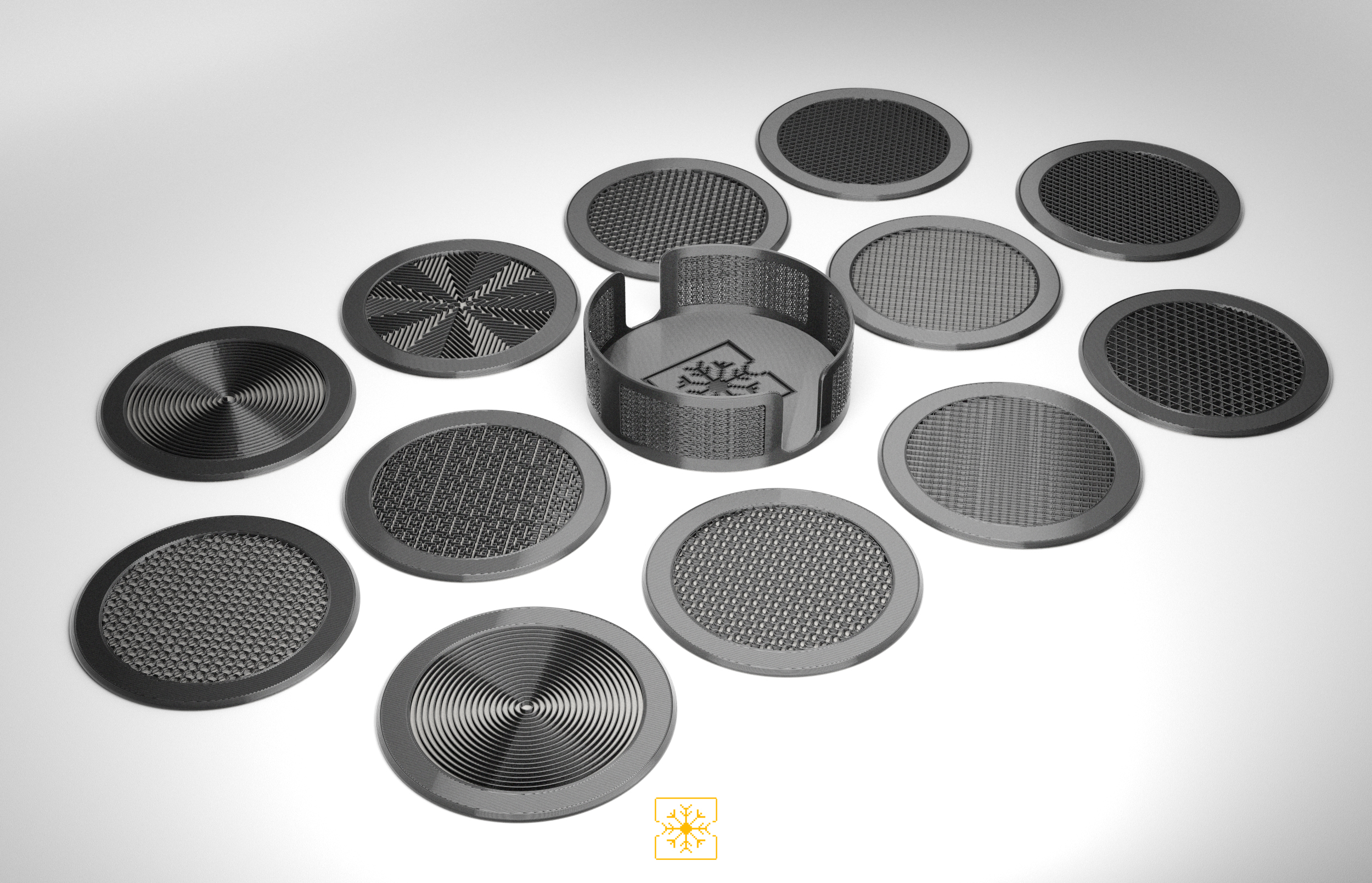 Bộ 12 đế lót ly kèm hộp đựng, tất cả đều dựa trên các họa tiết lưới (infill patterns) khác nhau có sẵn trong PrusaSlicer. Các đế lót ly được in 2 màu, với việc đổi màu ở lớp thứ 3.