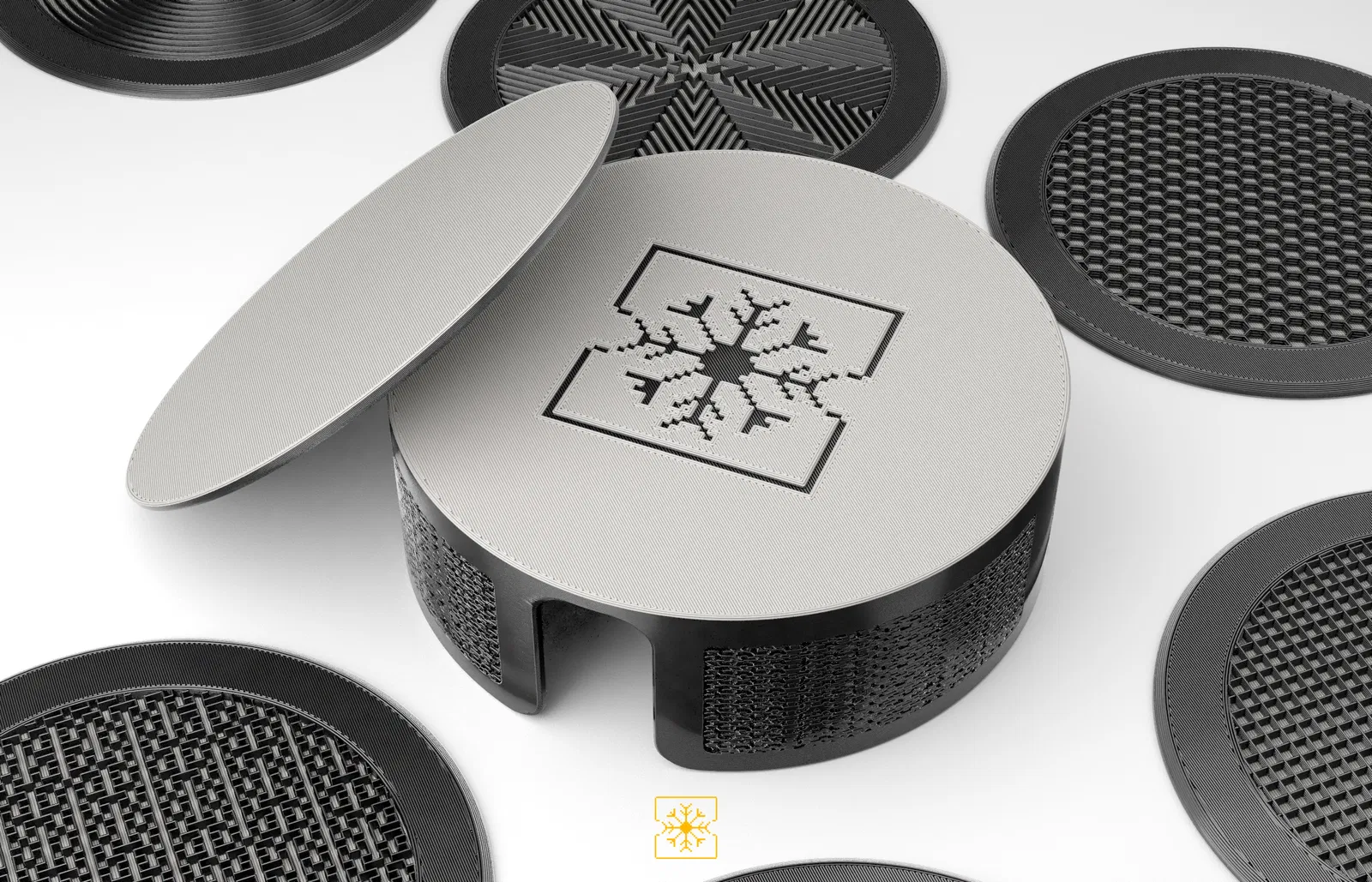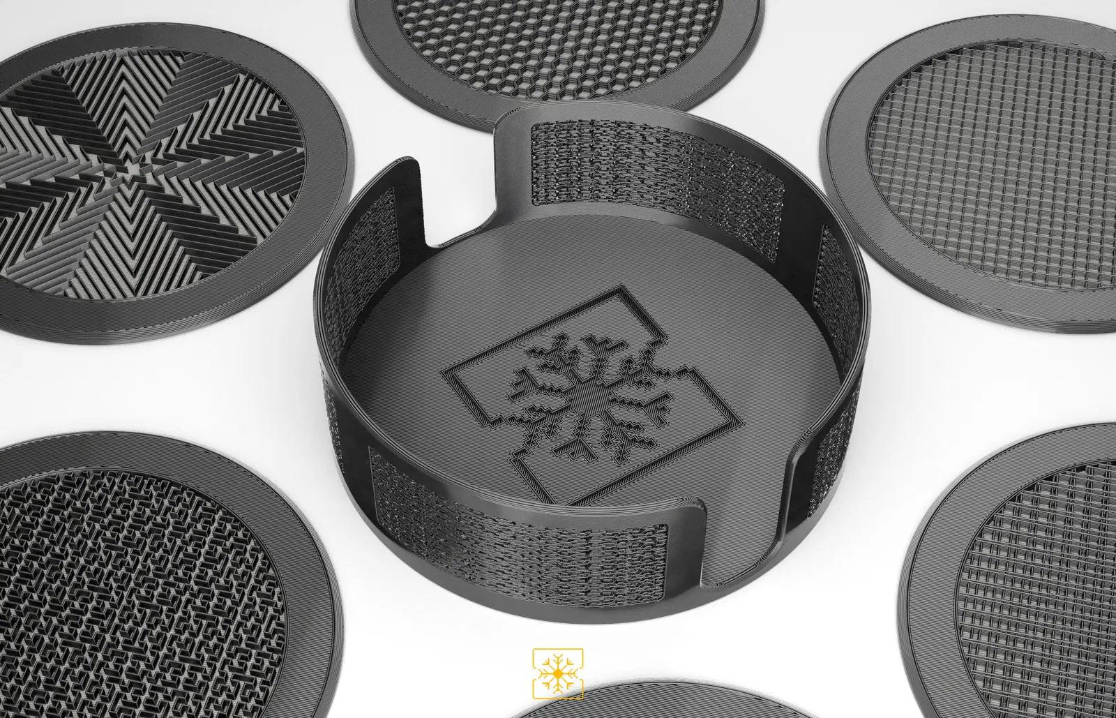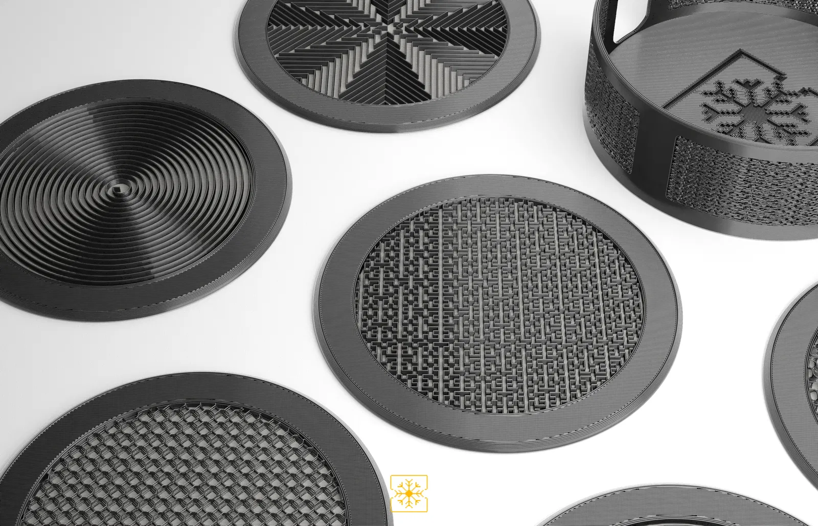 Bộ 12 đế lót ly kèm hộp đựng, tất cả đều dựa trên các họa tiết lưới (infill patterns) khác nhau có sẵn trong PrusaSlicer. Các đế lót ly được in 2 màu, với việc đổi màu ở lớp thứ 3.