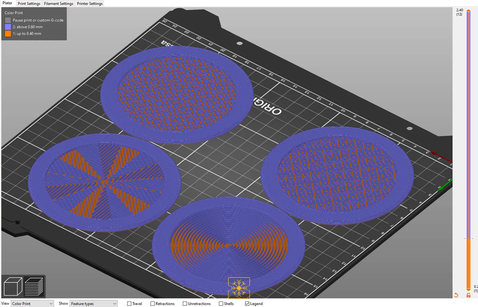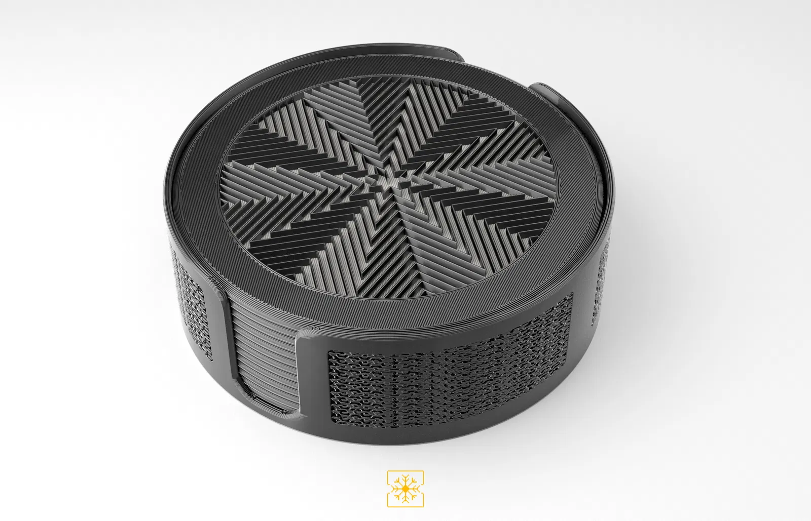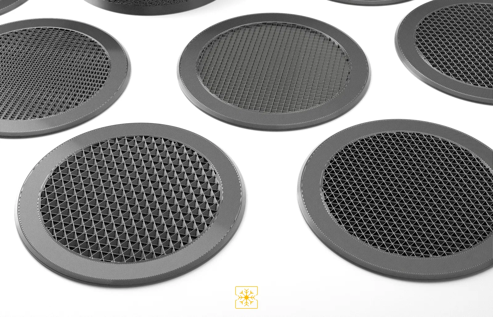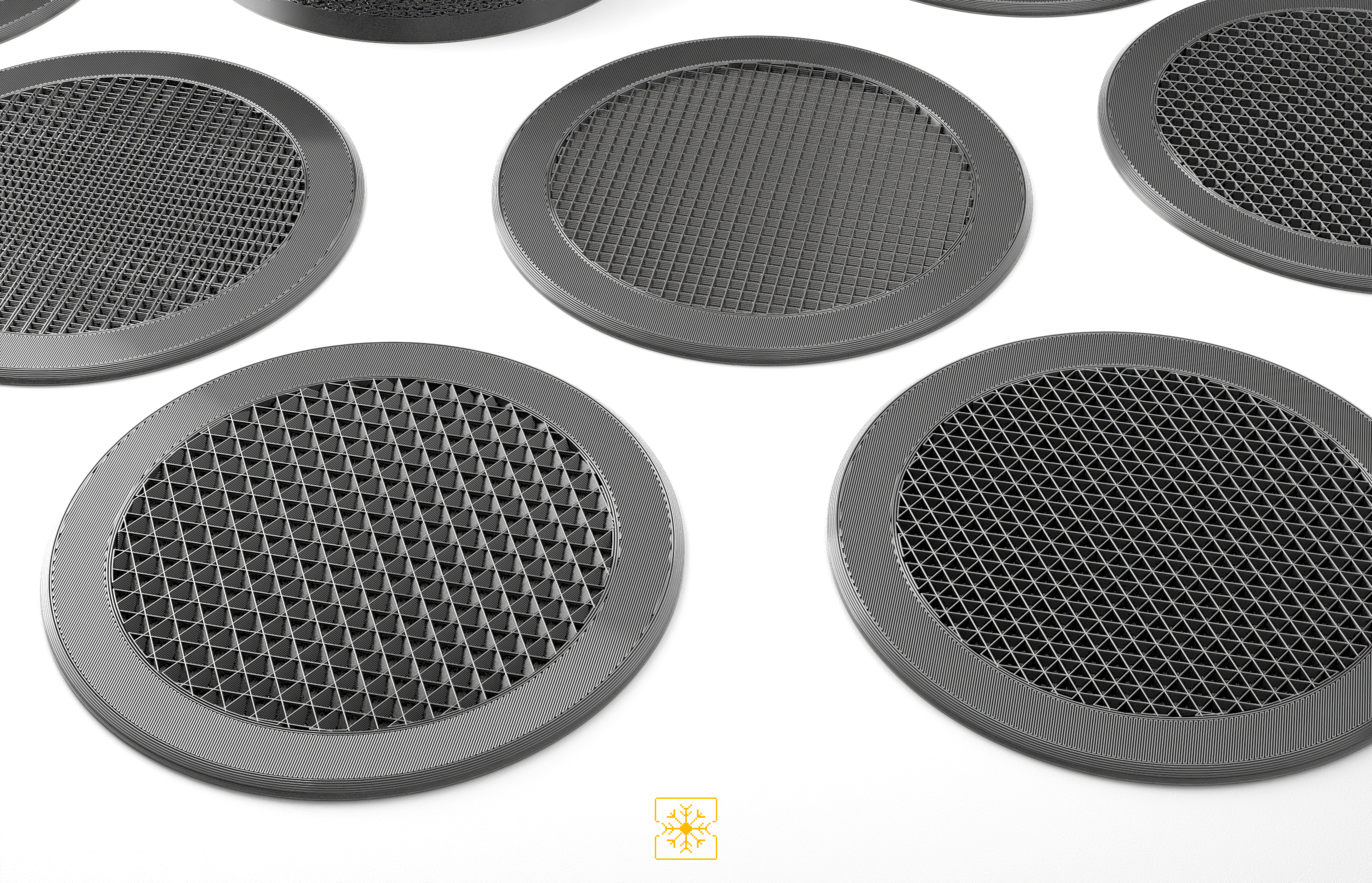 Bộ 12 đế lót ly kèm hộp đựng, tất cả đều dựa trên các họa tiết lưới (infill patterns) khác nhau có sẵn trong PrusaSlicer. Các đế lót ly được in 2 màu, với việc đổi màu ở lớp thứ 3.