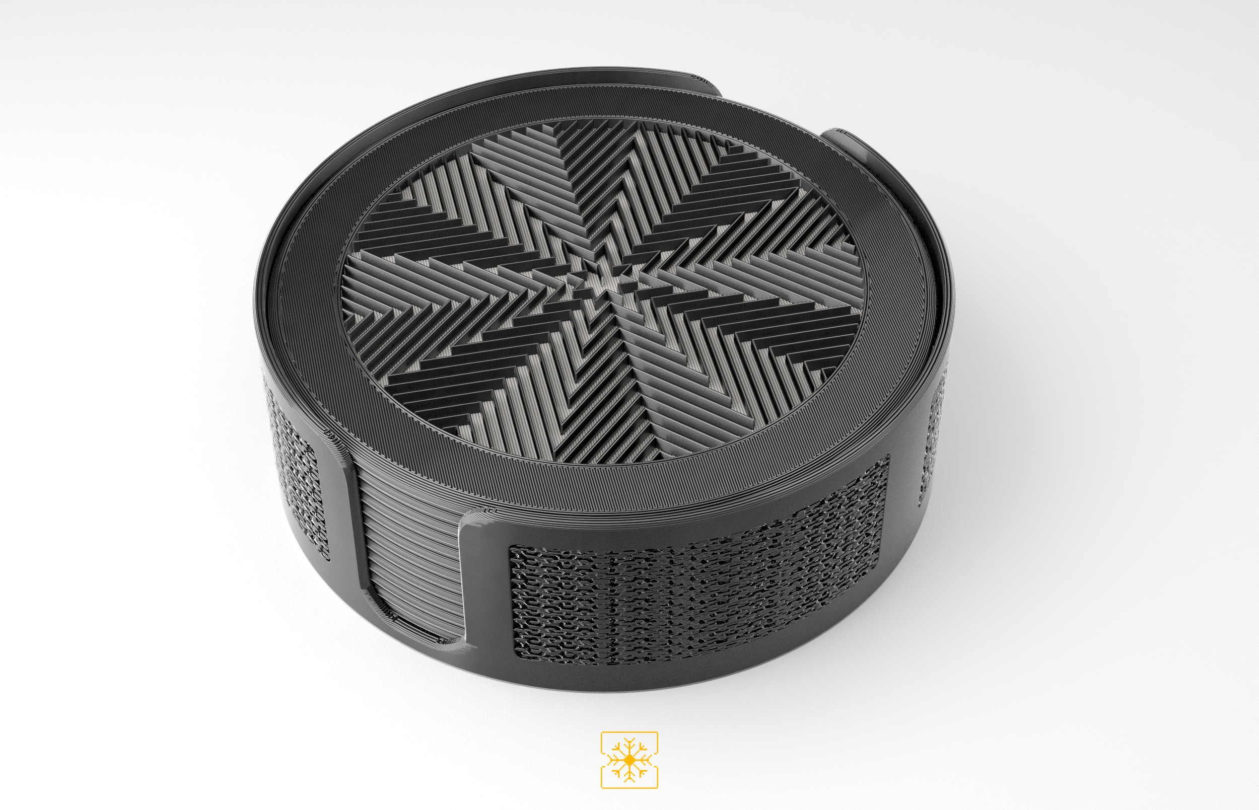Bộ 12 đế lót ly với hộp đựng, lấy cảm hứng từ các họa tiết lưới (infill patterns) trong PrusaSlicer. In 2 màu, đổi màu ở lớp 3 tạo điểm nhấn.