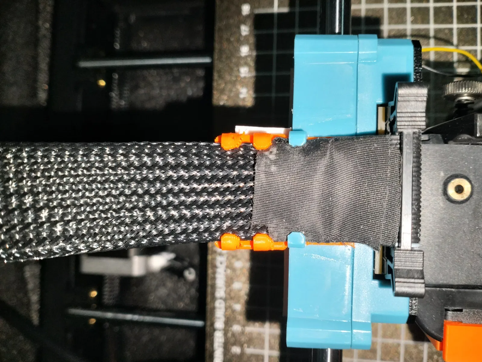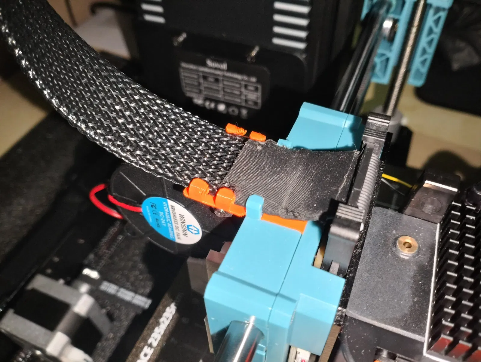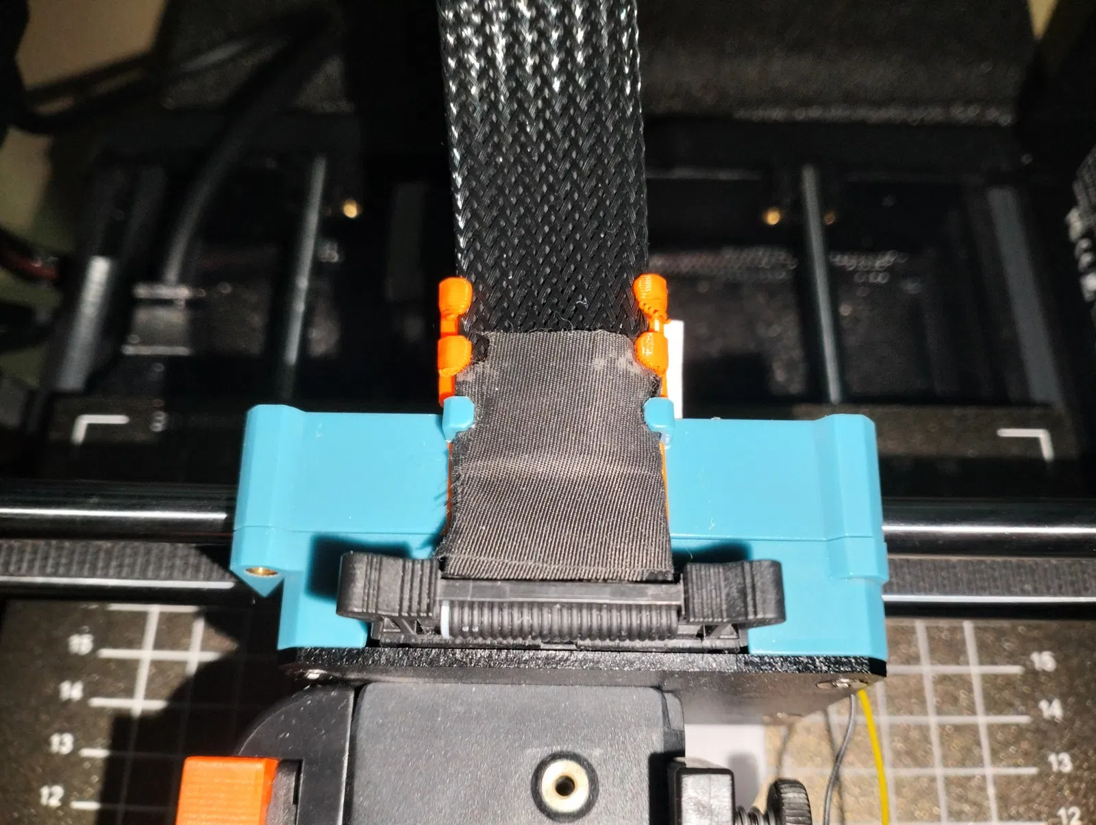 Mảnh đầu tiên gắn vào đầu dây cáp kết nối với bo mạch chính, giữ lại không gian ziptie ban đầu trong khi thêm một cái nữa ở một góc. Mảnh thứ hai lắp vào đầu in. Cài đặt - chỉ cần nghiêng 45 độ, trượt vào một bên, rồi bên kia, đảm bảo đủ khoảng trống để đẩy xuống.