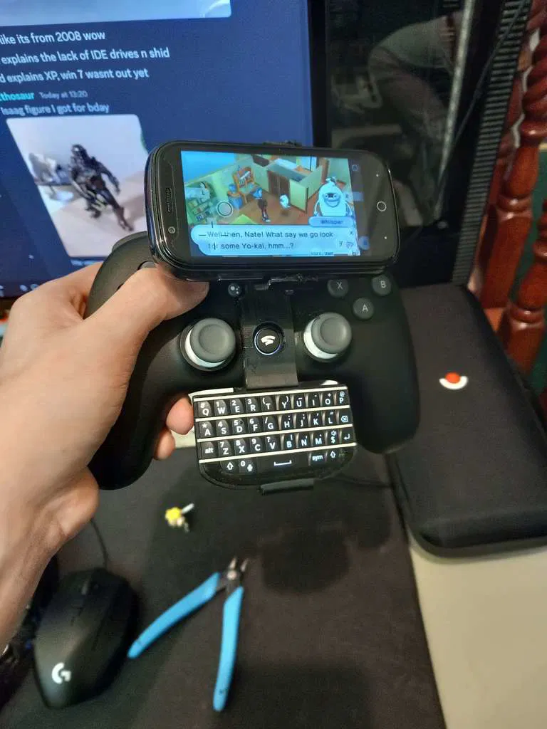 Một cái kẹp, có thể được cố định bằng dây chun (hoặc dây buộc tóc của bồ mày á) cho tay cầm Stadia, có thể kẹp cái điện thoại Unihertz Jelly Star. Cái cơ cấu này in ra 4 mảnh, rồi phải dán keo lại với một cái lò xo ở giữa.