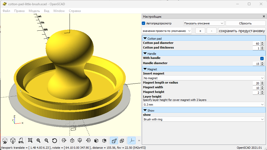 - Có tay cầm với nam châm (gắn vô lúc in luôn) Cái này cũng in được cái đồ gá để dễ lắp ráp nữa nha. Tui thiết kế hết trên OpenScad á, mấy bồ có thể tùy chỉnh theo kích thước bông tẩy trang hay nam châm gì cũng được. Muốn làm vậy thì tải file cotton-pad-little-brush.zip về, giải nén ra, rồi mở file cotton-pad-little-brush.scad bằng OpenScad nha.