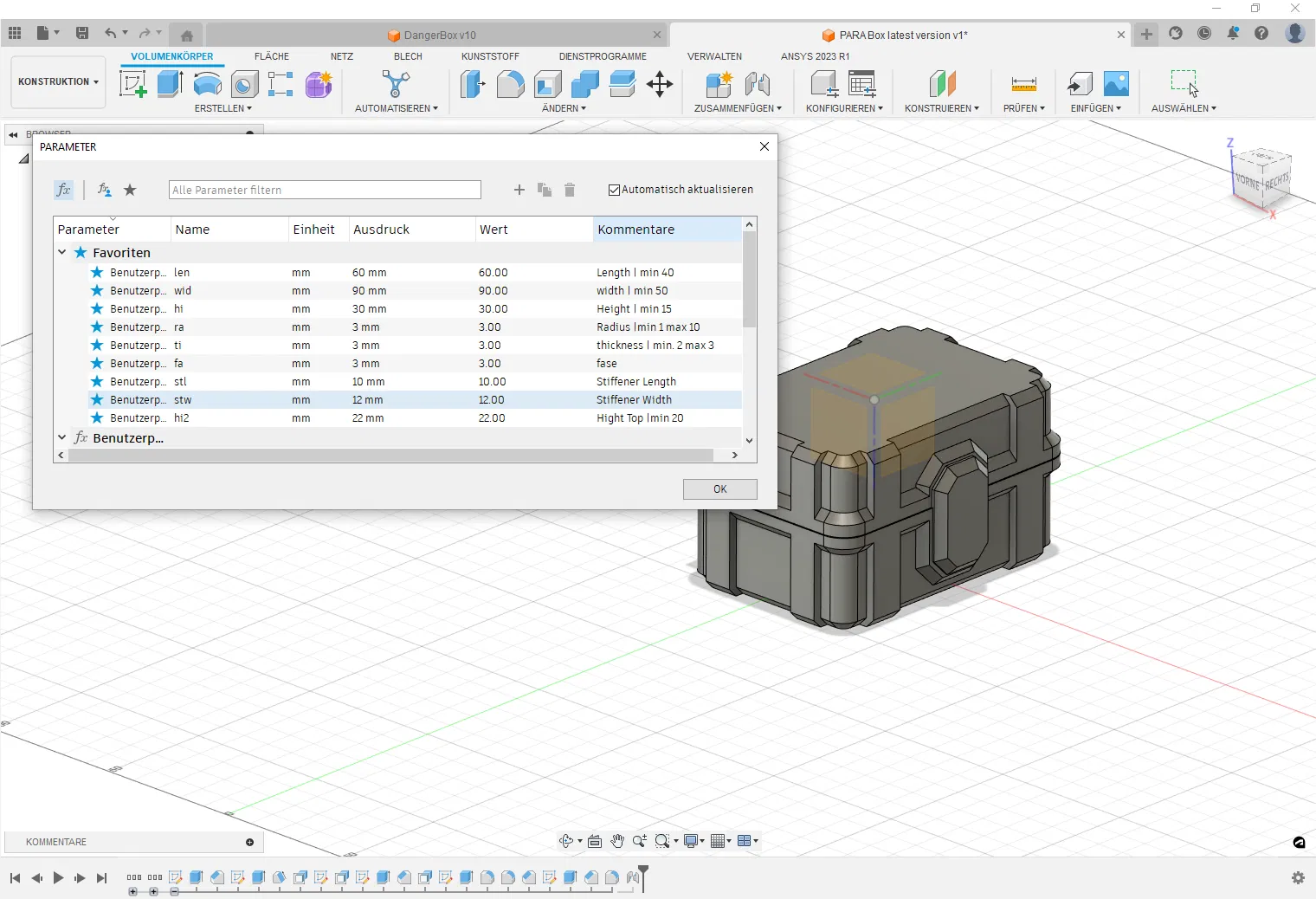 Cái hộp PARA BOX này là một hộp tùy chỉnh theo tham số, cho phép bạn thay đổi nhiều thông số theo ý muốn trong Fusion 360. Phiên bản này có bản lề sợi và phần đóng chắc chắn hơn.