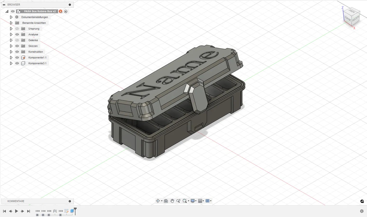 Hộp đựng thuốc PARA BOX Tablets là một hộp đựng thuốc chắc chắn với bảy ngăn, được dán nhãn từ Thứ Hai đến Chủ Nhật, giúp thuốc không bị lẫn lộn. Bạn có thể tùy chỉnh tên của mình vào tệp Fusion360 đi kèm.